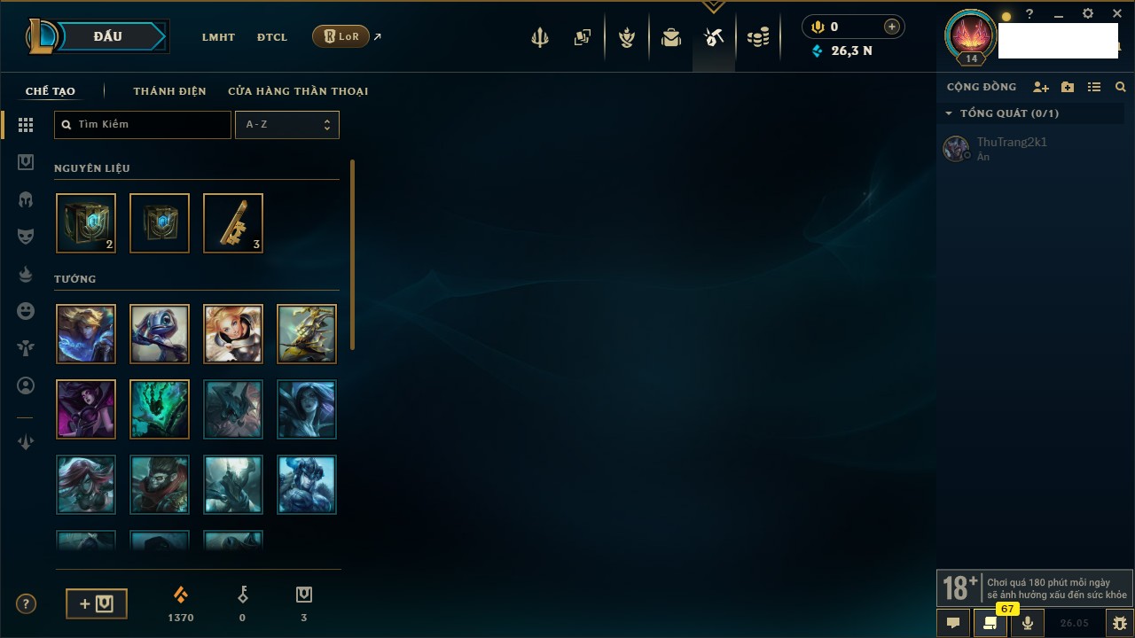 Rank Đơn: Chưa rank mùa nàoKhung: Chưa có khungTướng: 160 - Còn 7629 THXTrang Phục: 5Rank ĐTCL: Chưa RankLinh Thú: 19