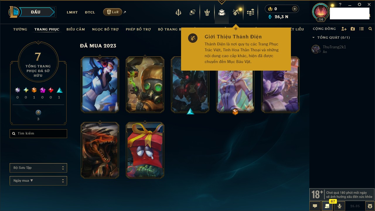Rank Đơn: Chưa rank mùa nàoKhung: Chưa có khungTướng: 152 - Còn 8255 THXTrang Phục: 7Rank ĐTCL: Chưa RankLinh Thú: 37