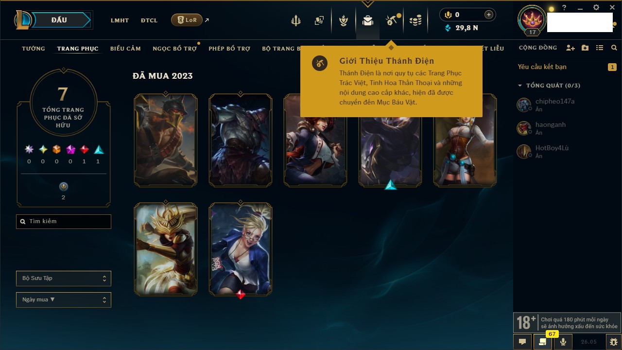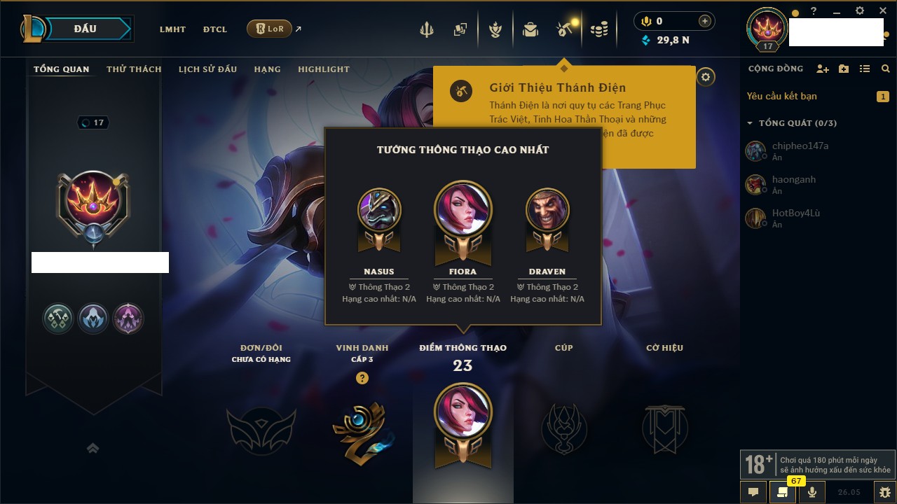 Rank Đơn: Chưa rank mùa nàoKhung: Chưa có khungTướng: 152 - Còn 8255 THXTrang Phục: 7Rank ĐTCL: Chưa RankLinh Thú: 37