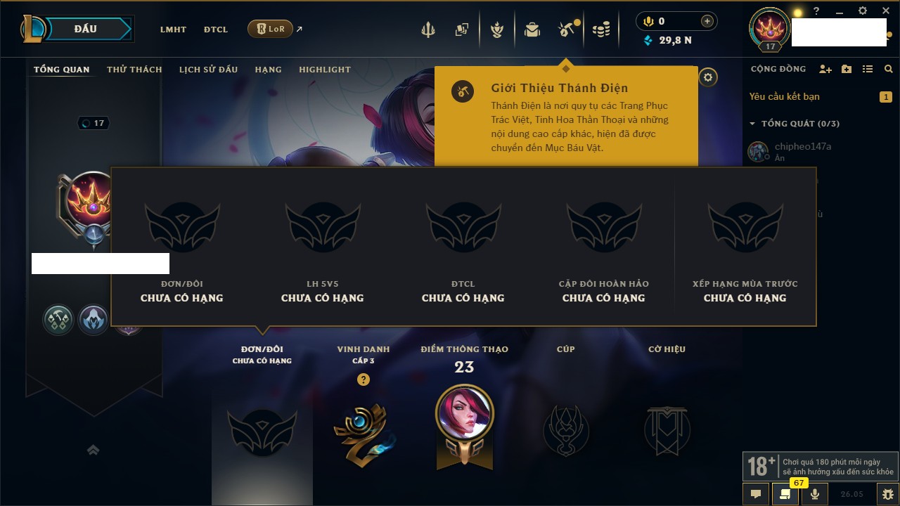 Rank Đơn: Chưa rank mùa nàoKhung: Chưa có khungTướng: 5 - Còn 6300 THXTrang Phục: 0Rank ĐTCL: Bạc IIILinh Thú: 17