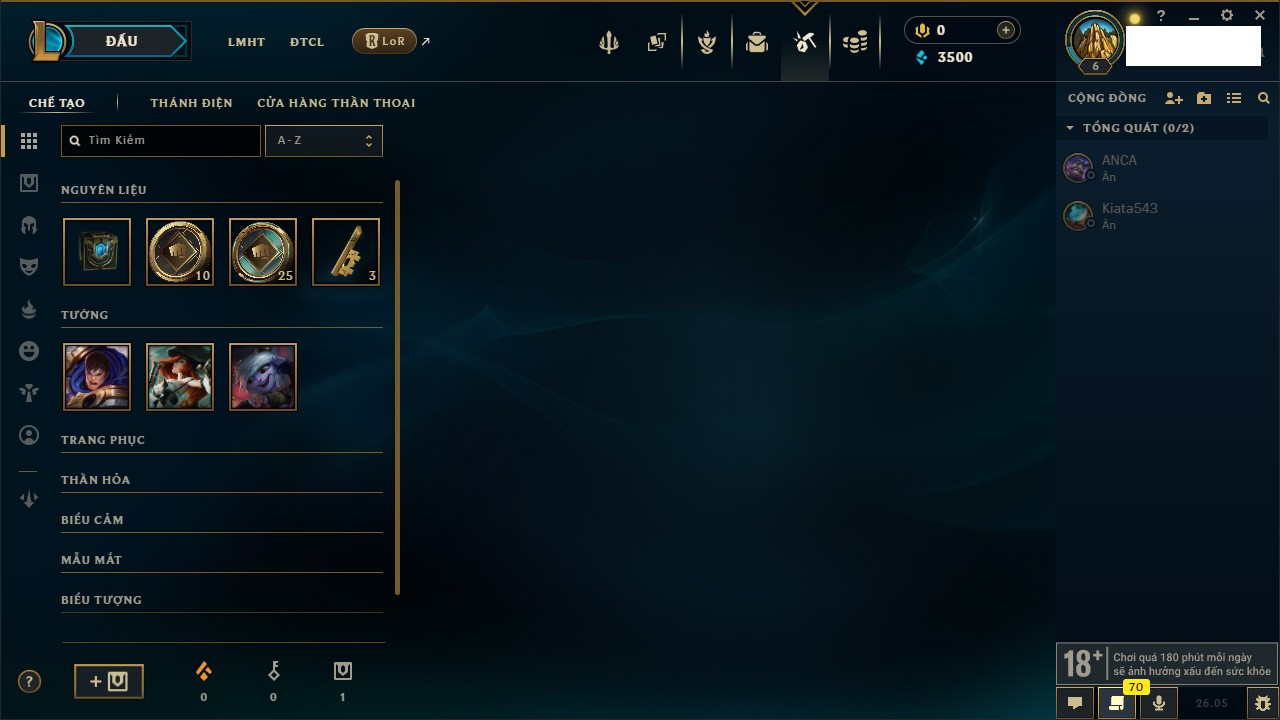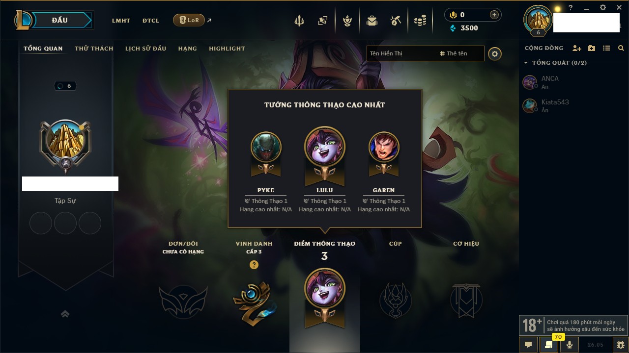 Rank Đơn: Chưa rank mùa nàoKhung: Chưa có khungTướng: 27 - Còn 2125 THXTrang Phục: 1Rank ĐTCL: Chưa RankLinh Thú: 22