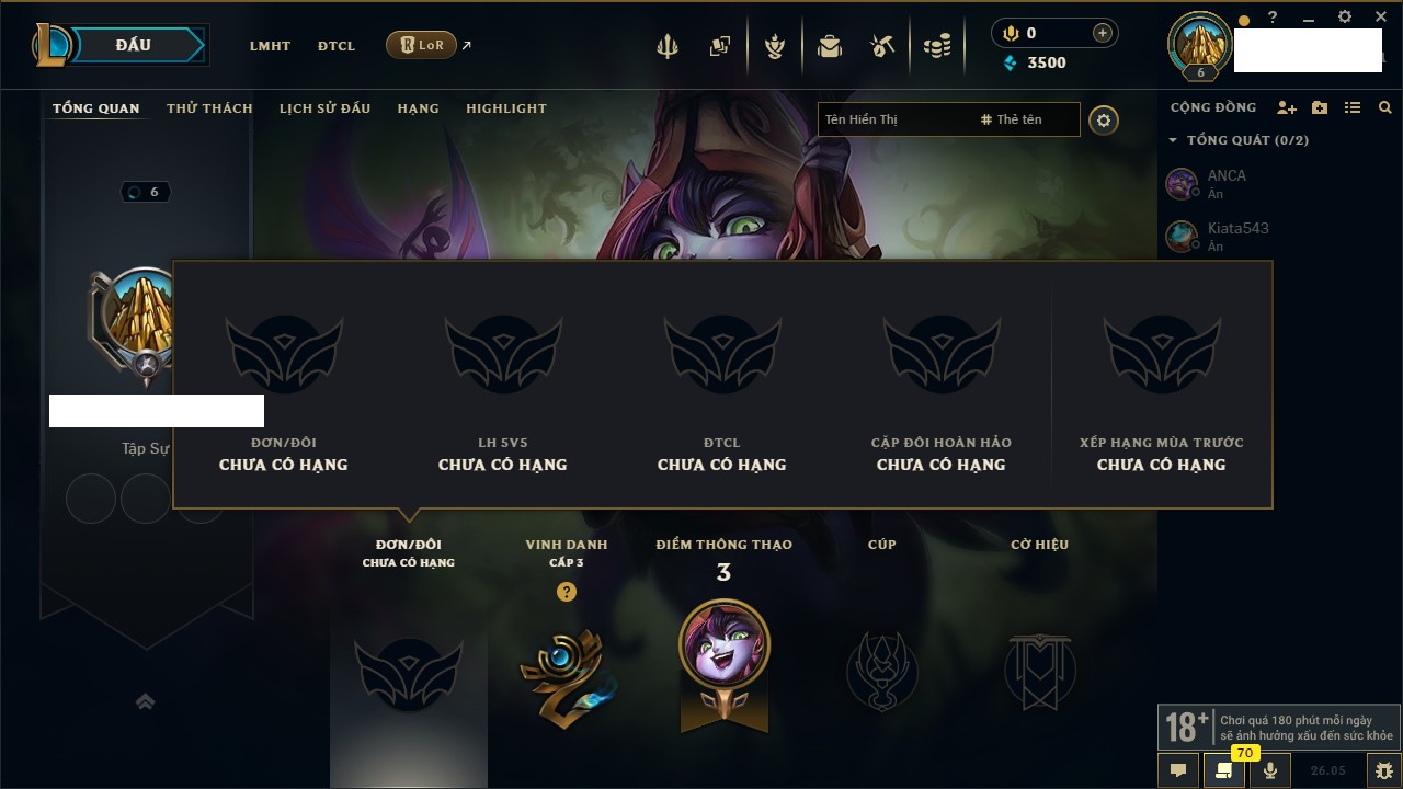Rank Đơn: Chưa rank mùa nàoKhung: Chưa có khungTướng: 147 - Còn 12786 THXTrang Phục: 0Rank ĐTCL: Chưa RankLinh Thú: 22