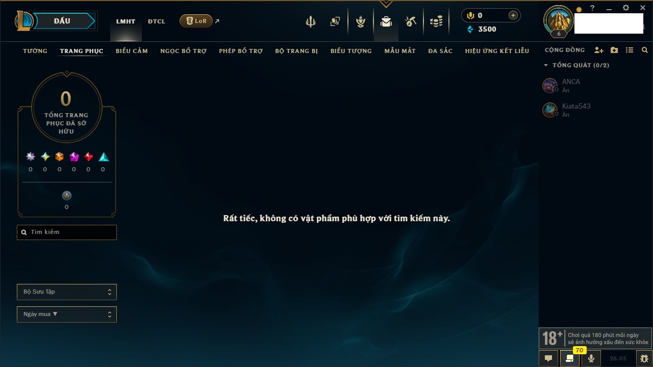 Rank Đơn: Chưa rank mùa nàoKhung: Chưa có khungTướng: 91 - Còn 4500 THXTrang Phục: 0Rank ĐTCL: Chưa RankLinh Thú: 8