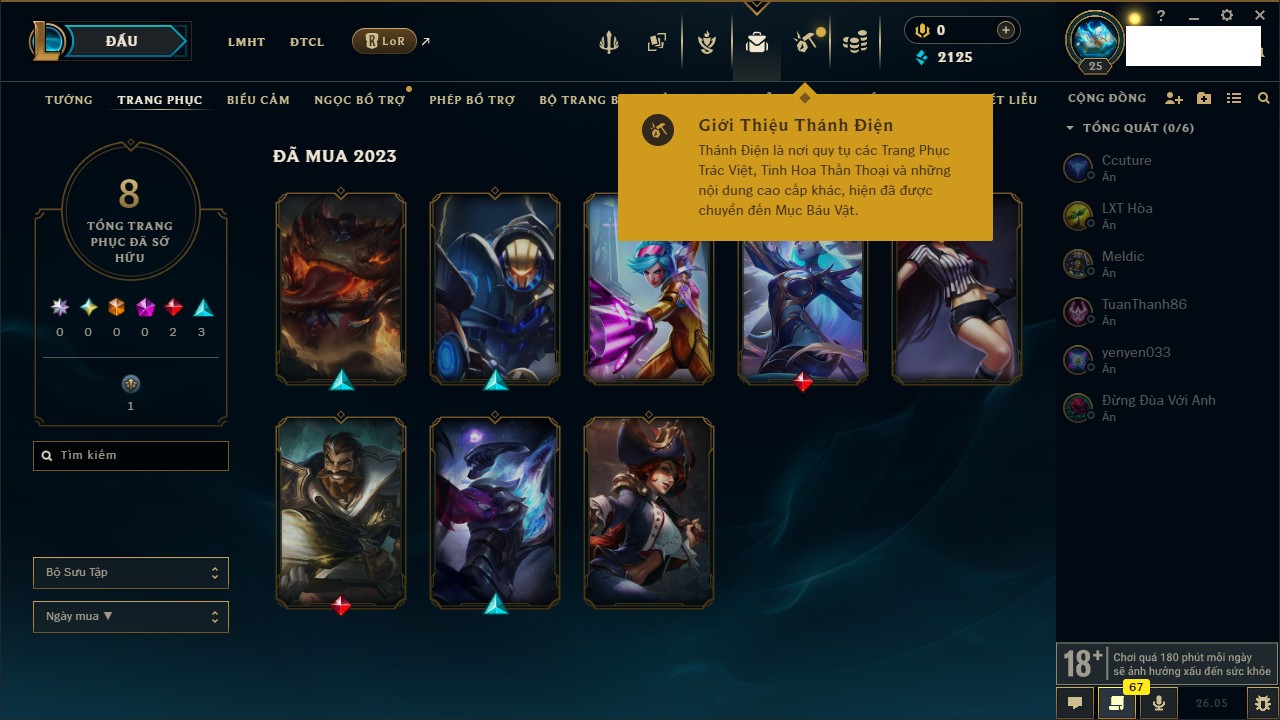 Rank Đơn: Chưa rank mùa nàoKhung: Chưa có khungTướng: 154 - Còn 1660 THXTrang Phục: 6Rank ĐTCL: Chưa RankLinh Thú: 18