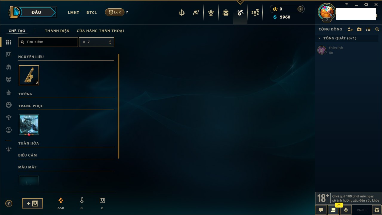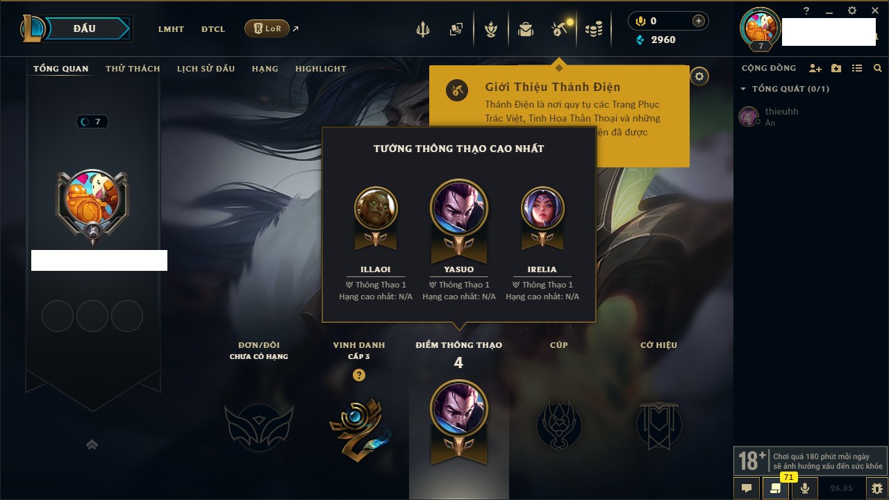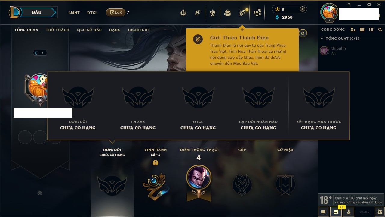 Rank Đơn: Chưa rank mùa nàoKhung: Chưa có khungTướng: 47 - Còn 2960 THXTrang Phục: 1Rank ĐTCL: Chưa RankLinh Thú: 8