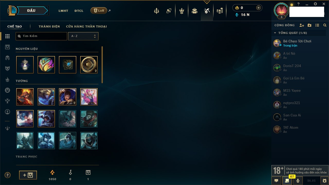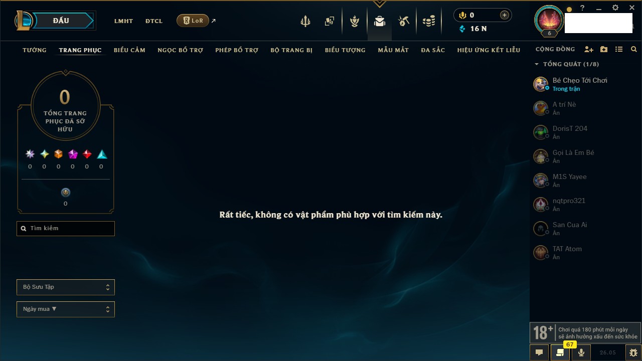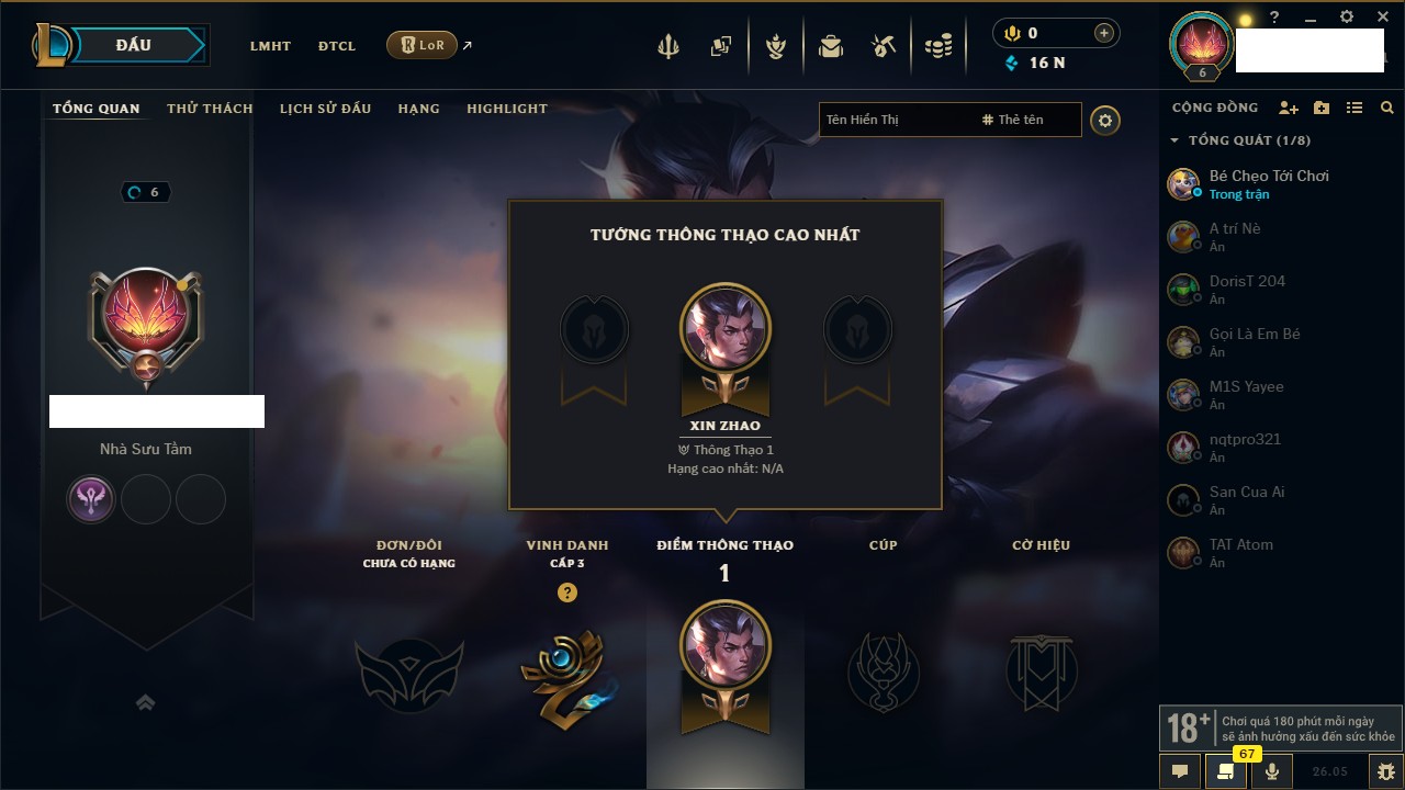 Rank Đơn: Chưa rank mùa nàoKhung: Chưa có khungTướng: 1 - Còn 0 THXTrang Phục: 0Rank ĐTCL: Chưa RankLinh Thú: 10