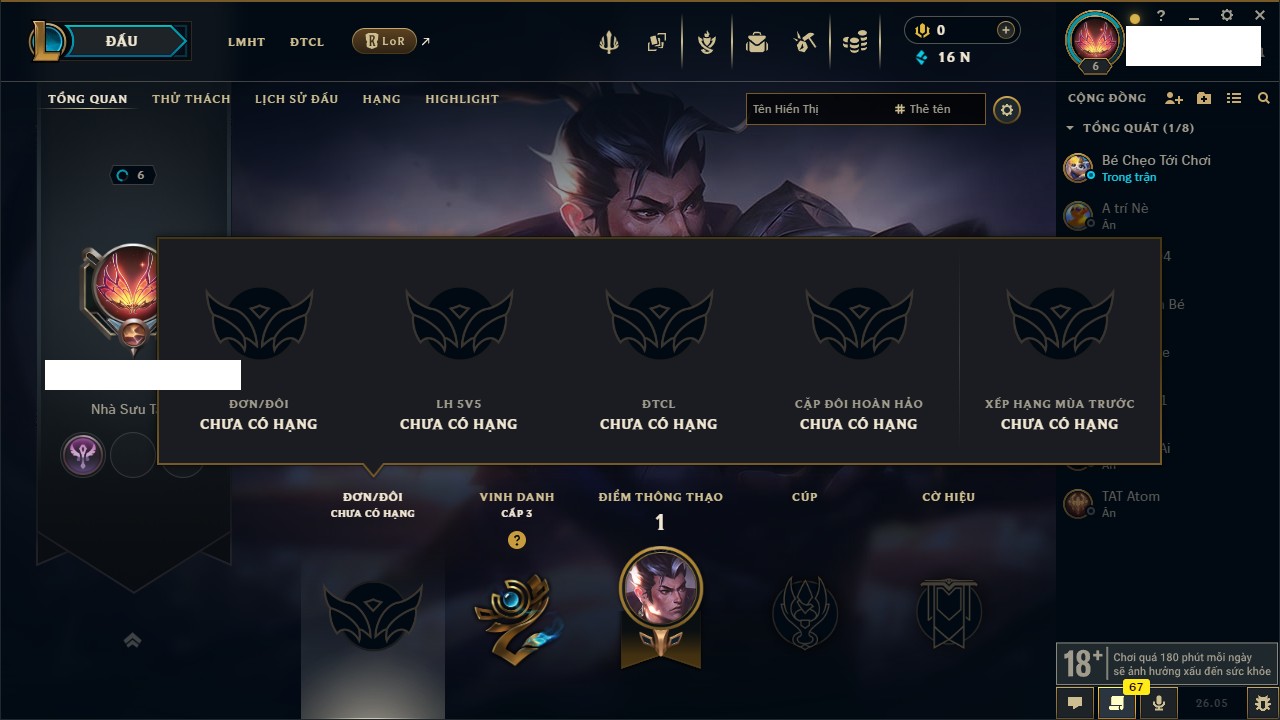 Rank Đơn: Chưa rank mùa nàoKhung: Chưa có khungTướng: 5 - Còn 6300 THXTrang Phục: 0Rank ĐTCL: Bạc IIILinh Thú: 17