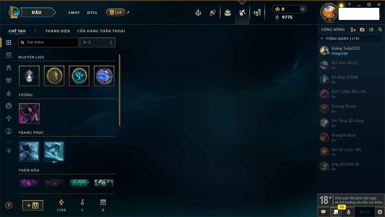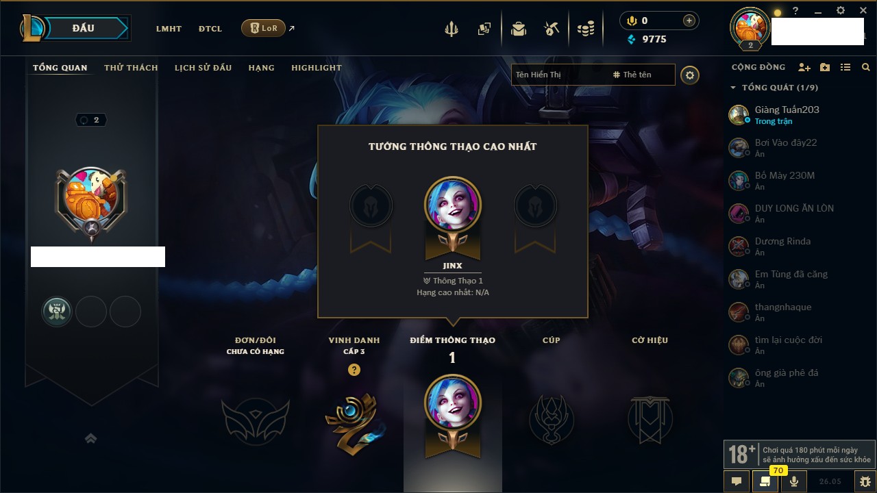 Rank Đơn: Chưa rank mùa nàoKhung: Chưa có khungTướng: 68 - Còn 3050 THXTrang Phục: 0Rank ĐTCL: Chưa RankLinh Thú: 9