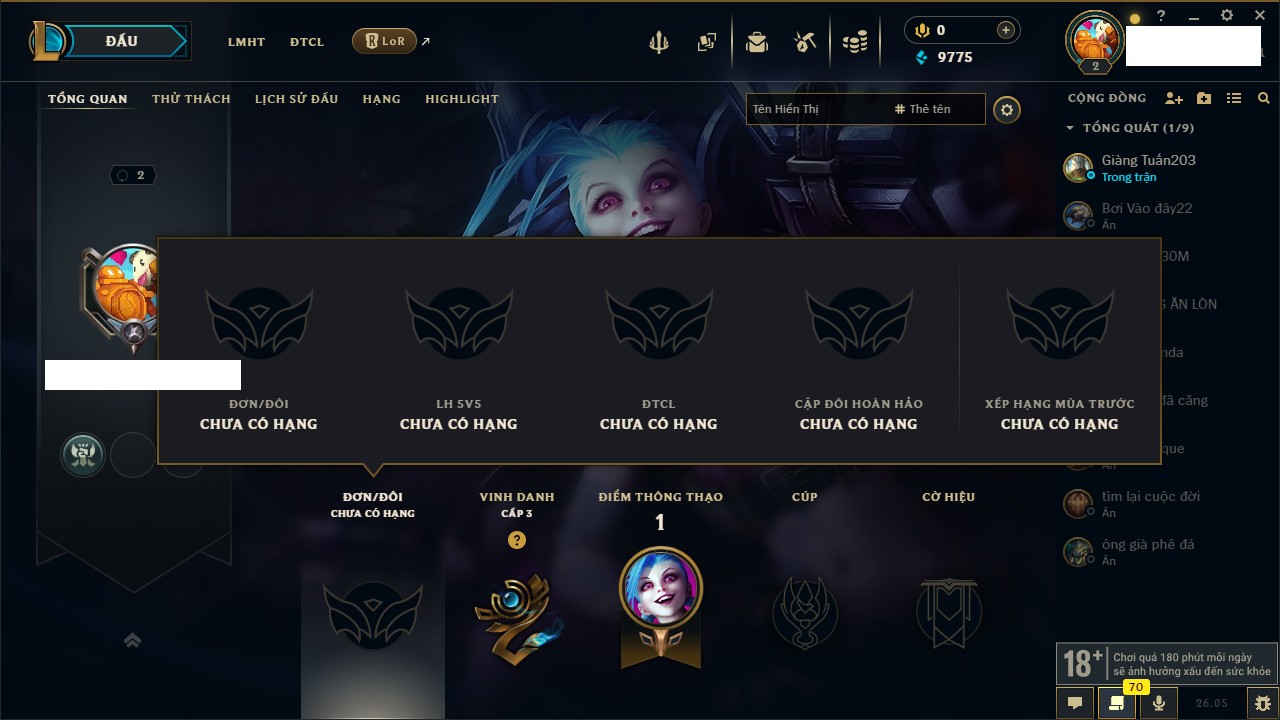 Rank Đơn: Chưa rank mùa nàoKhung: Chưa có khungTướng: 67 - Còn 2499 THXTrang Phục: 0Rank ĐTCL: Chưa RankLinh Thú: 12