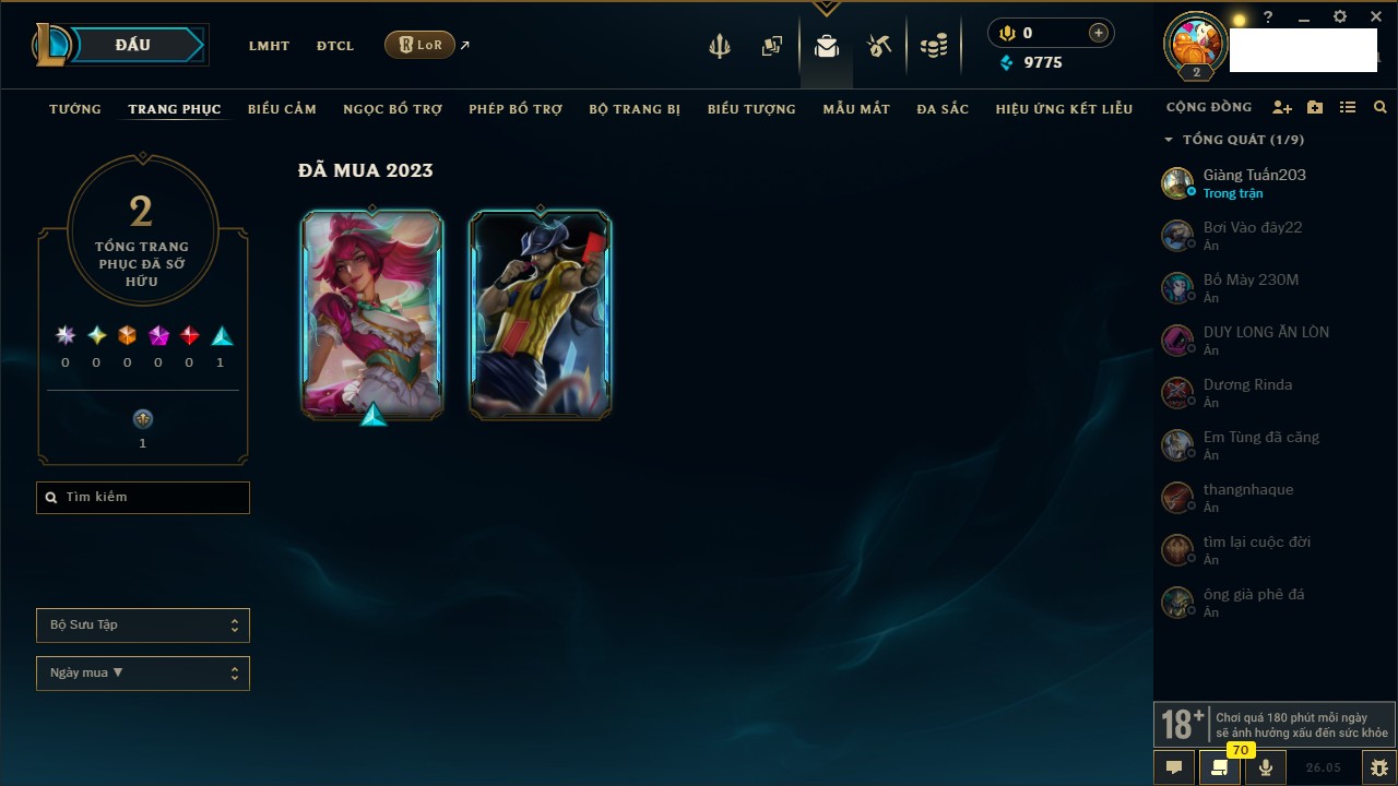 Rank Đơn: Chưa rank mùa nàoKhung: Chưa có khungTướng: 27 - Còn 2900 THXTrang Phục: 4Rank ĐTCL: Chưa RankLinh Thú: 24