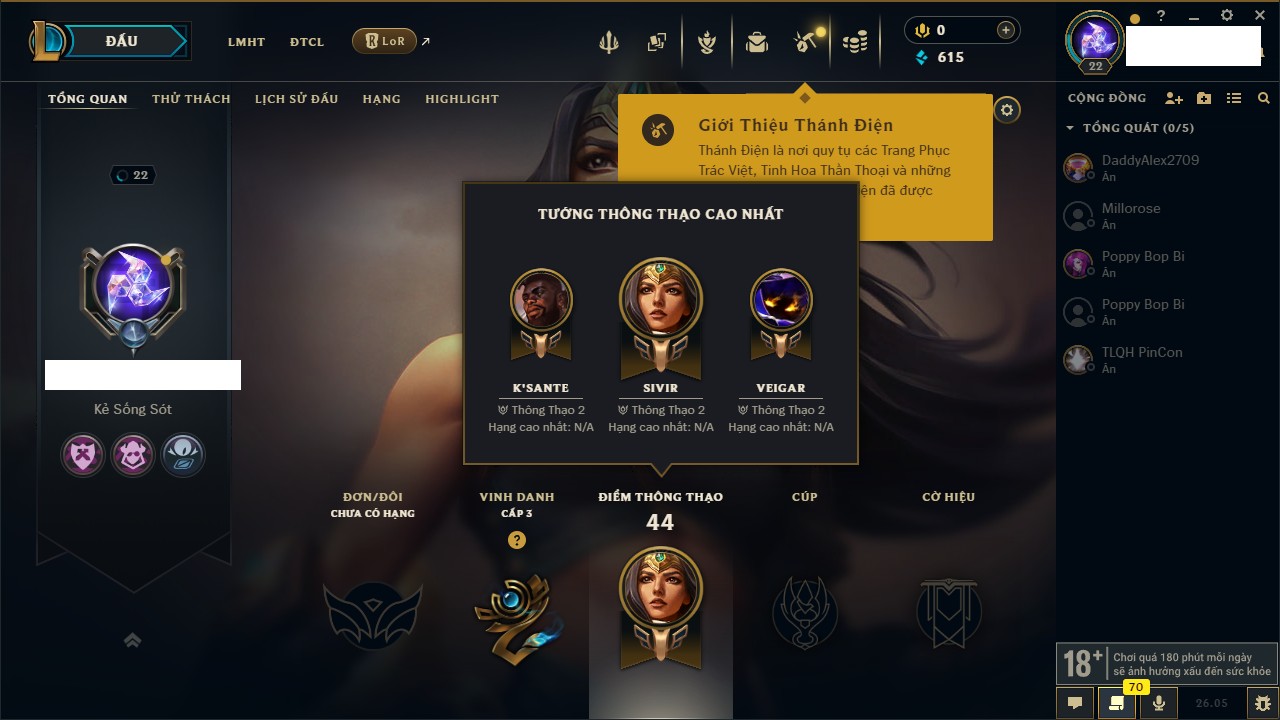 Rank Đơn: Chưa rank mùa nàoKhung: Chưa có khungTướng: 75 - Còn 4086 THXTrang Phục: 1Rank ĐTCL: Chưa RankLinh Thú: 7
