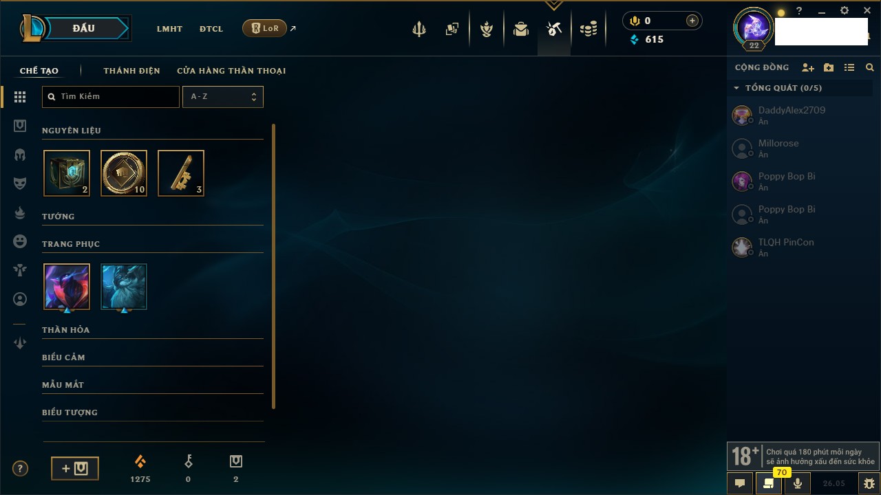 Rank Đơn: Chưa rank mùa nàoKhung: Chưa có khungTướng: 67 - Còn 2499 THXTrang Phục: 0Rank ĐTCL: Chưa RankLinh Thú: 12