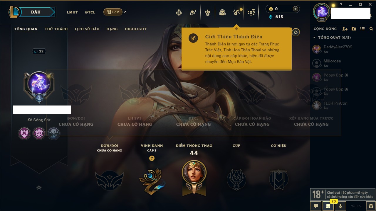 Rank Đơn: Chưa rank mùa nàoKhung: Chưa có khungTướng: 68 - Còn 3050 THXTrang Phục: 0Rank ĐTCL: Chưa RankLinh Thú: 9