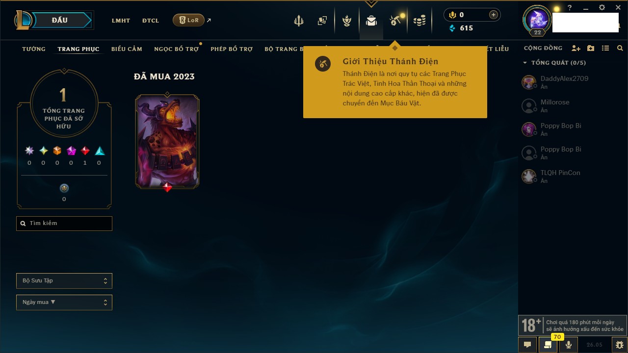 Rank Đơn: Chưa rank mùa nàoKhung: Chưa có khungTướng: 27 - Còn 2900 THXTrang Phục: 4Rank ĐTCL: Chưa RankLinh Thú: 24