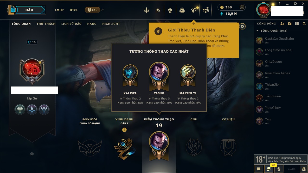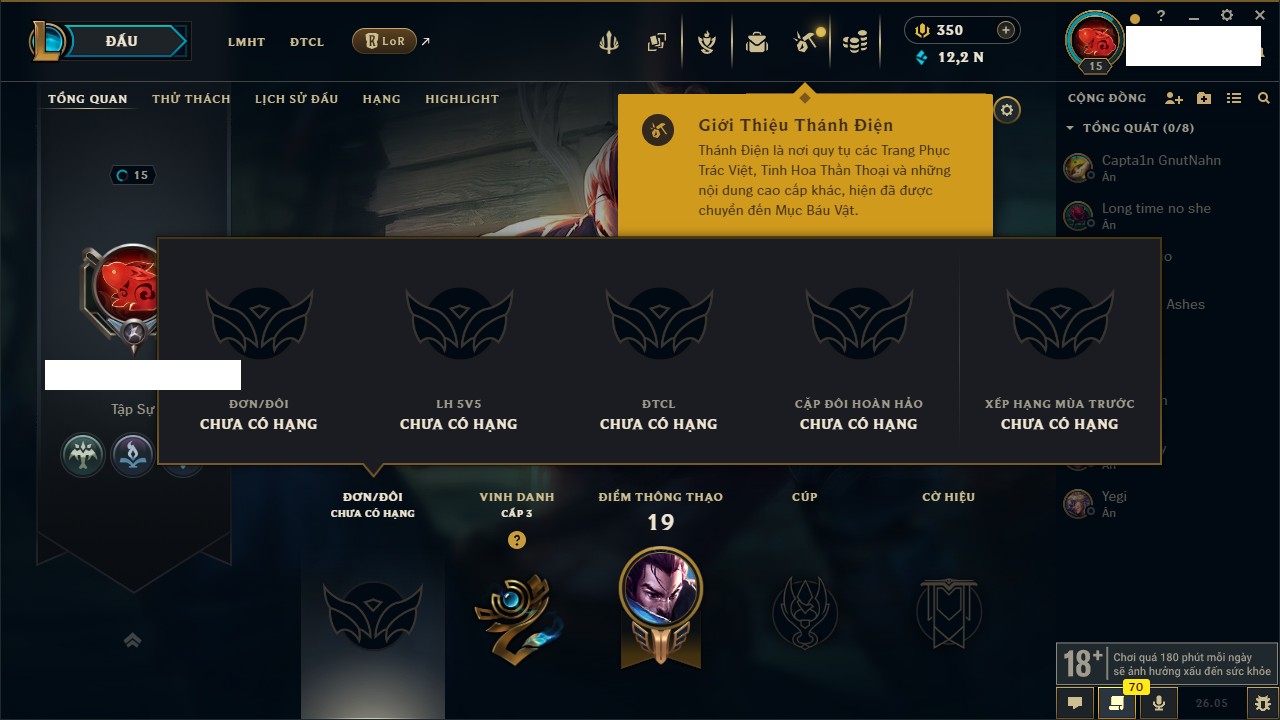 Rank Đơn: Chưa rank mùa nàoKhung: Chưa có khungTướng: 66 - Còn 2350 THXTrang Phục: 0Rank ĐTCL: Chưa RankLinh Thú: 13