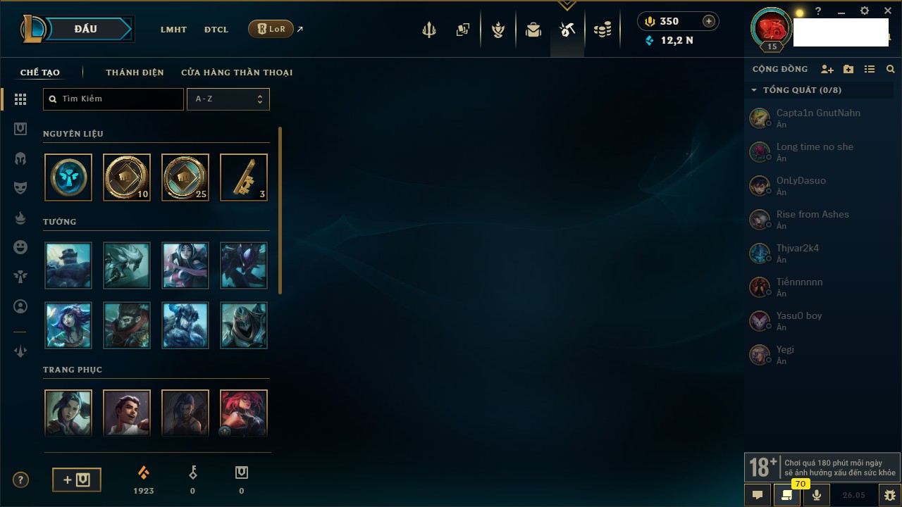 Rank Đơn: Chưa rank mùa nàoKhung: Chưa có khungTướng: 27 - Còn 2900 THXTrang Phục: 4Rank ĐTCL: Chưa RankLinh Thú: 24