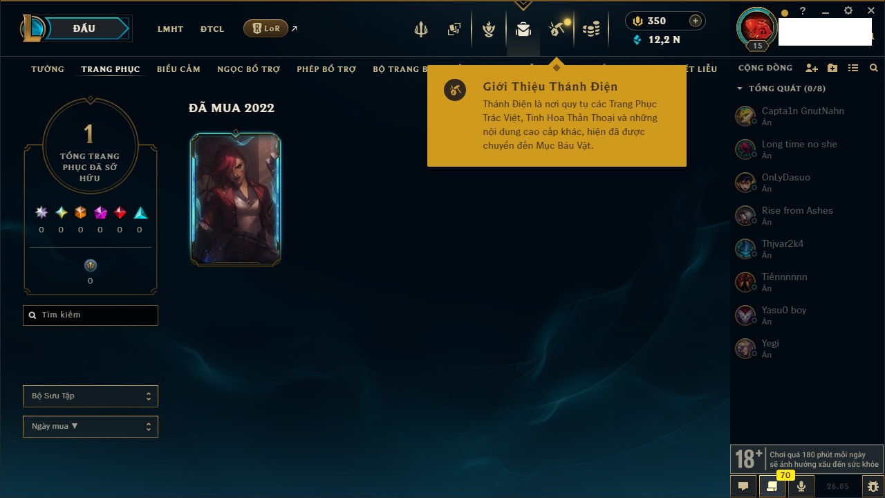 Rank Đơn: Chưa rank mùa nàoKhung: Chưa có khungTướng: 67 - Còn 2499 THXTrang Phục: 0Rank ĐTCL: Chưa RankLinh Thú: 12
