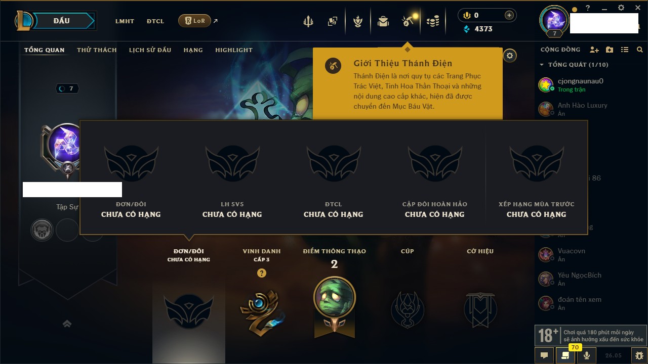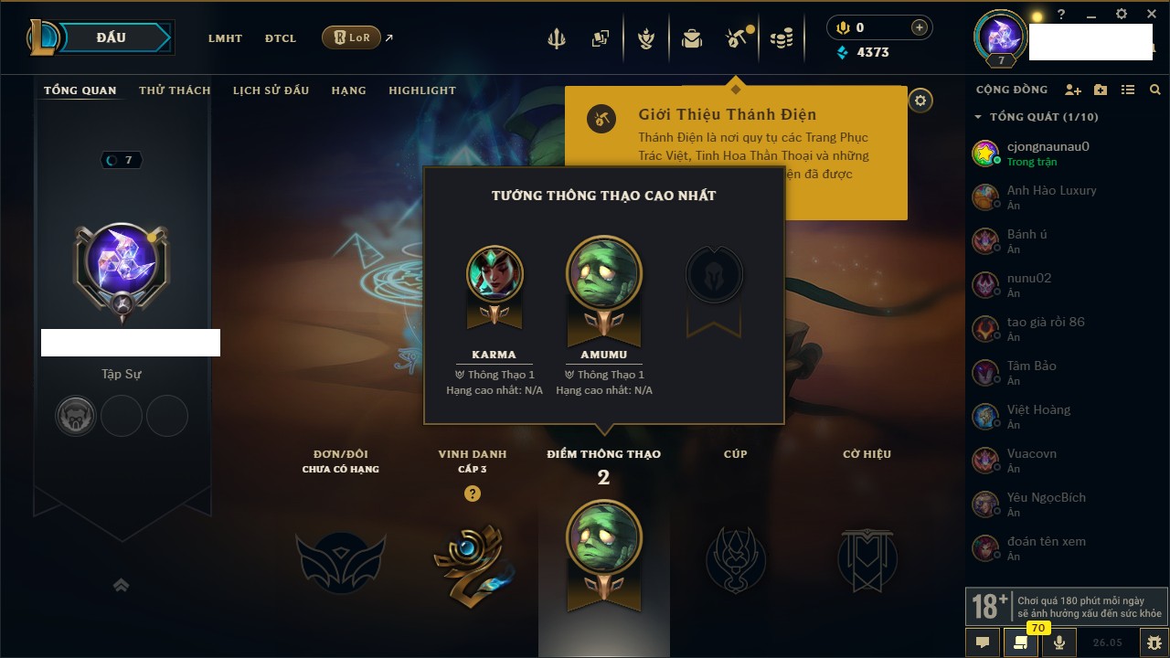 Rank Đơn: Chưa rank mùa nàoKhung: Chưa có khungTướng: 75 - Còn 4373 THXTrang Phục: 1Rank ĐTCL: Chưa RankLinh Thú: 25