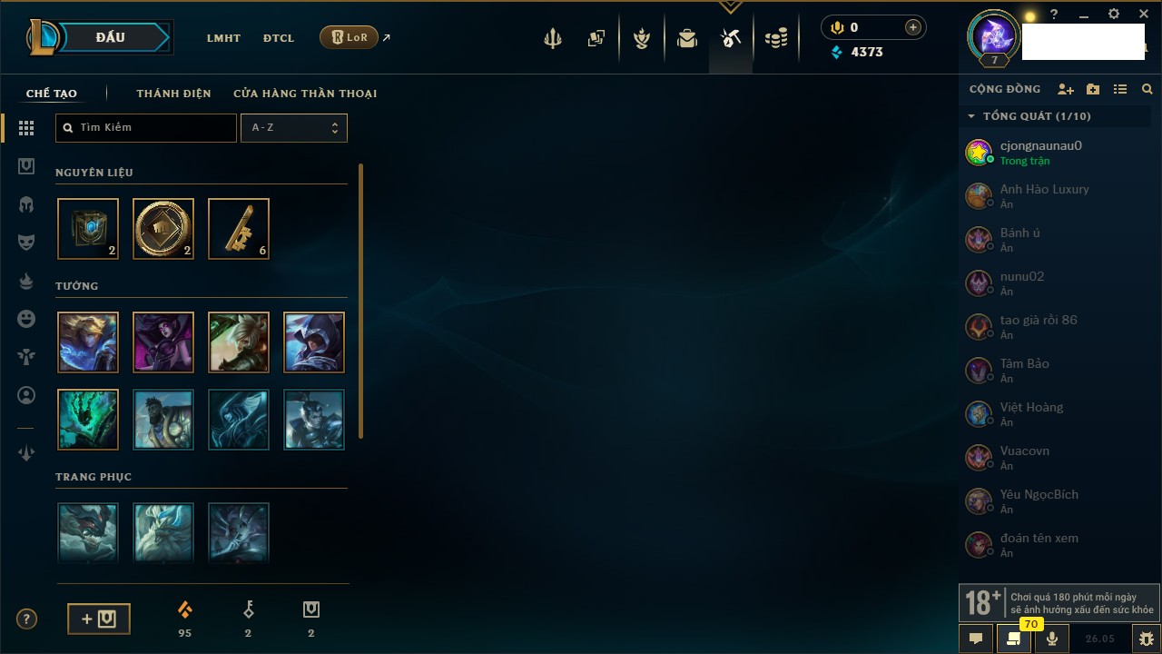 Rank Đơn: Chưa rank mùa nàoKhung: Chưa có khungTướng: 148 - Còn 1440 THXTrang Phục: 2Rank ĐTCL: Chưa RankLinh Thú: 6