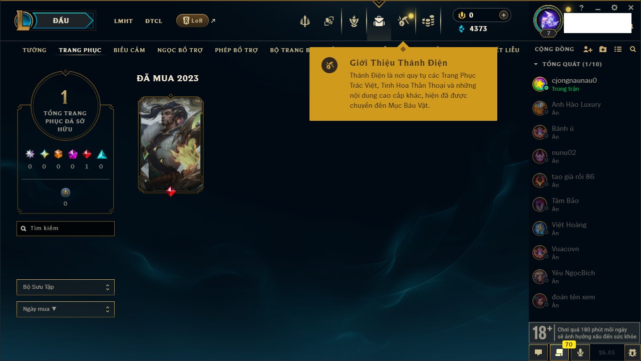 Rank Đơn: Chưa rank mùa nàoKhung: Chưa có khungTướng: 137 - Còn 4170 THXTrang Phục: 6Rank ĐTCL: Chưa RankLinh Thú: 11