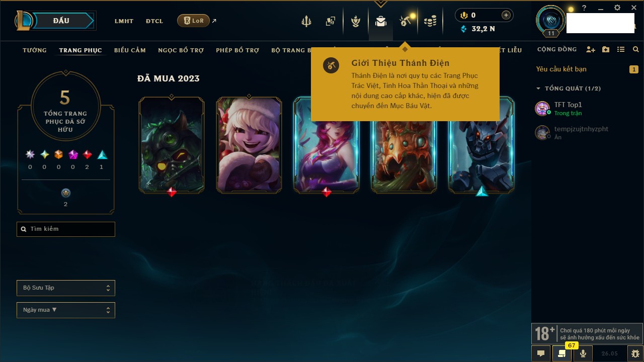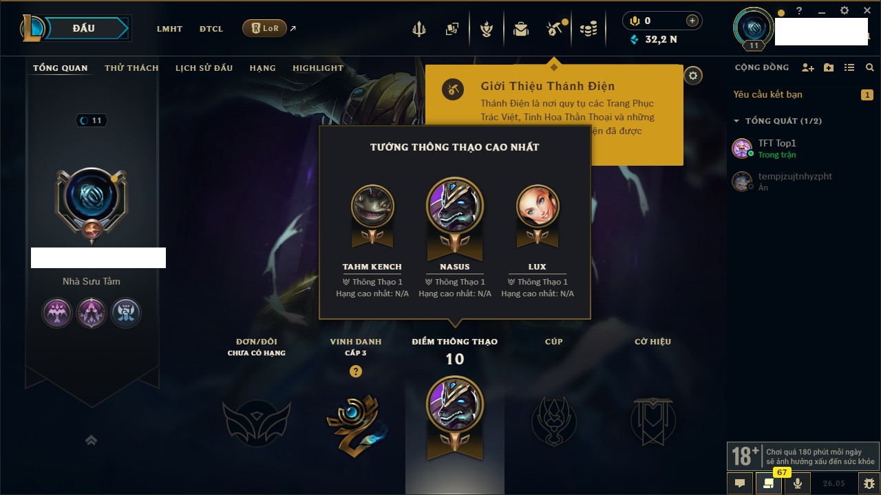 Rank Đơn: Chưa rank mùa nàoKhung: Chưa có khungTướng: 158 - Còn 4875 THXTrang Phục: 3Rank ĐTCL: Chưa RankLinh Thú: 12