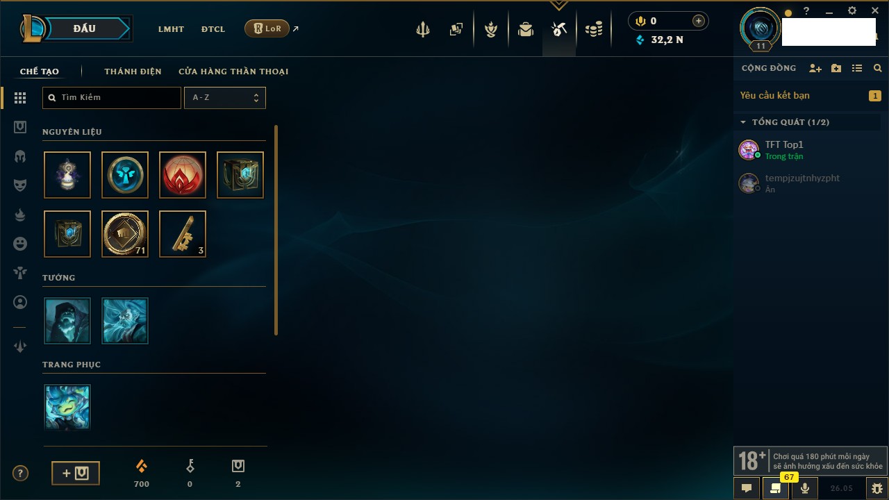 Rank Đơn: Chưa rank mùa nàoKhung: Chưa có khungTướng: 158 - Còn 23070 THXTrang Phục: 4Rank ĐTCL: Chưa RankLinh Thú: 76