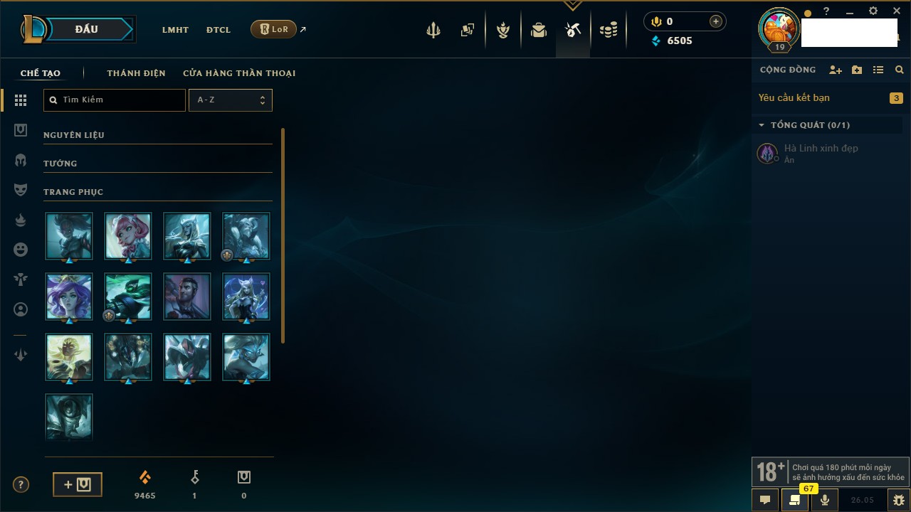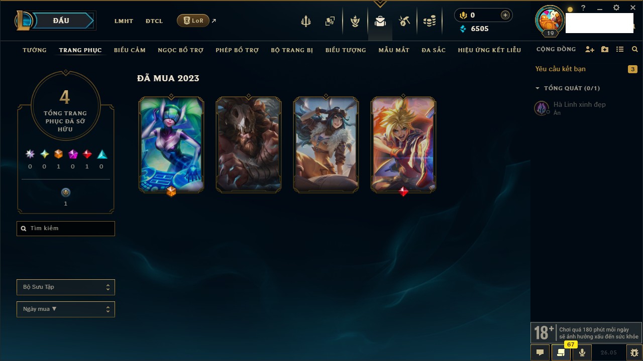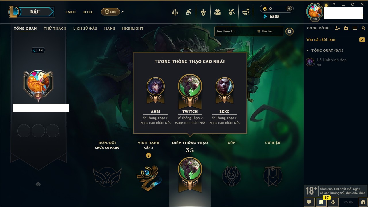 Rank Đơn: Chưa rank mùa nàoKhung: Chưa có khungTướng: 158 - Còn 4875 THXTrang Phục: 3Rank ĐTCL: Chưa RankLinh Thú: 12