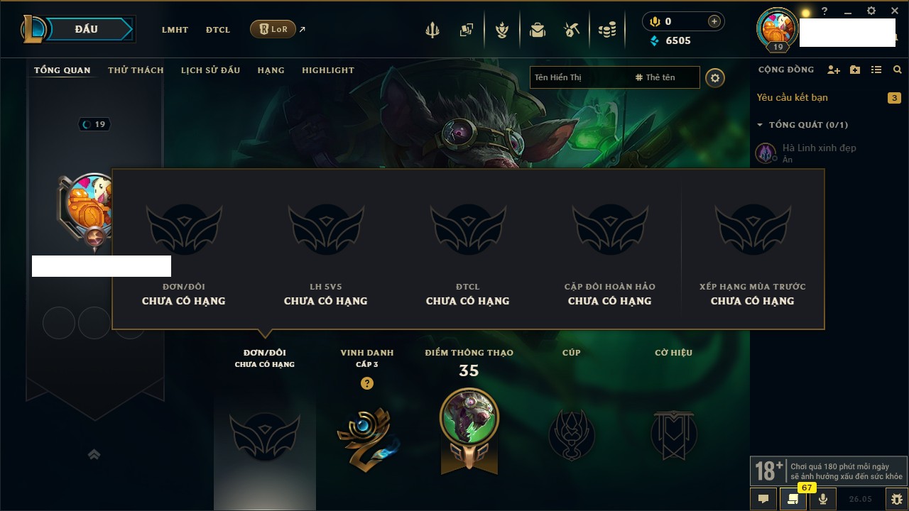 Rank Đơn: Chưa rank mùa nàoKhung: Chưa có khungTướng: 157 - Còn 2524 THXTrang Phục: 0Rank ĐTCL: Chưa RankLinh Thú: 28