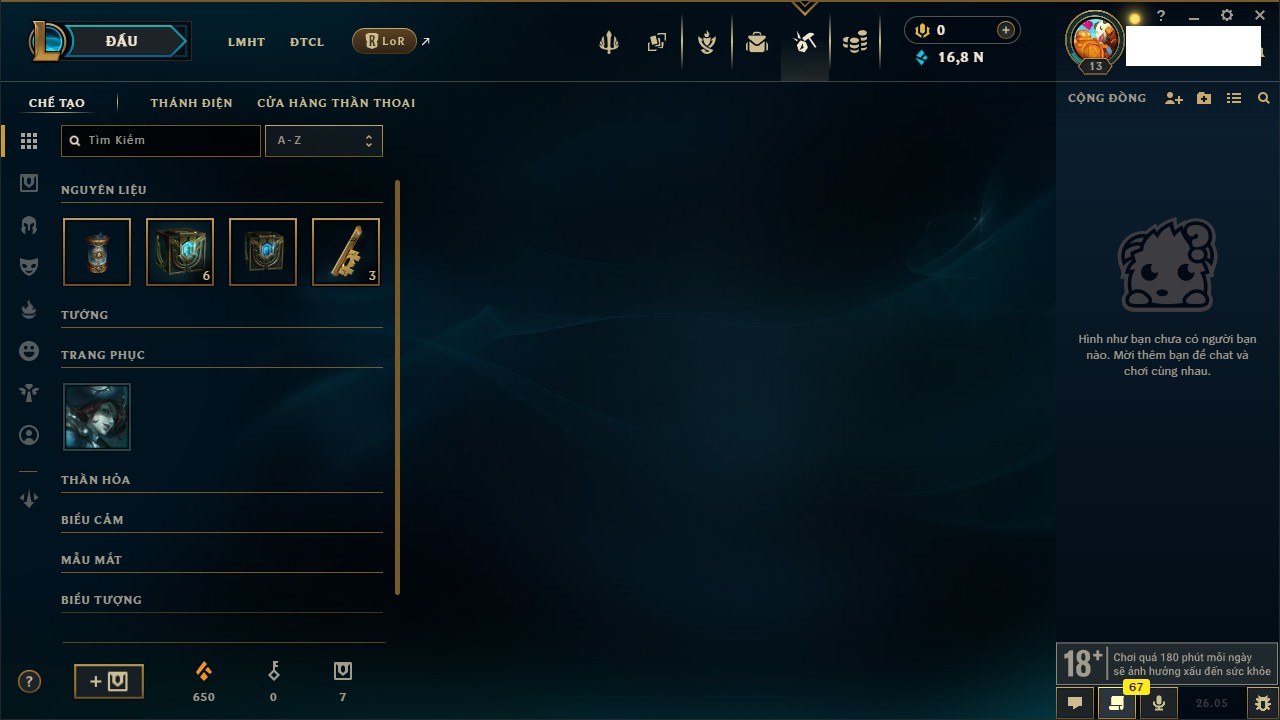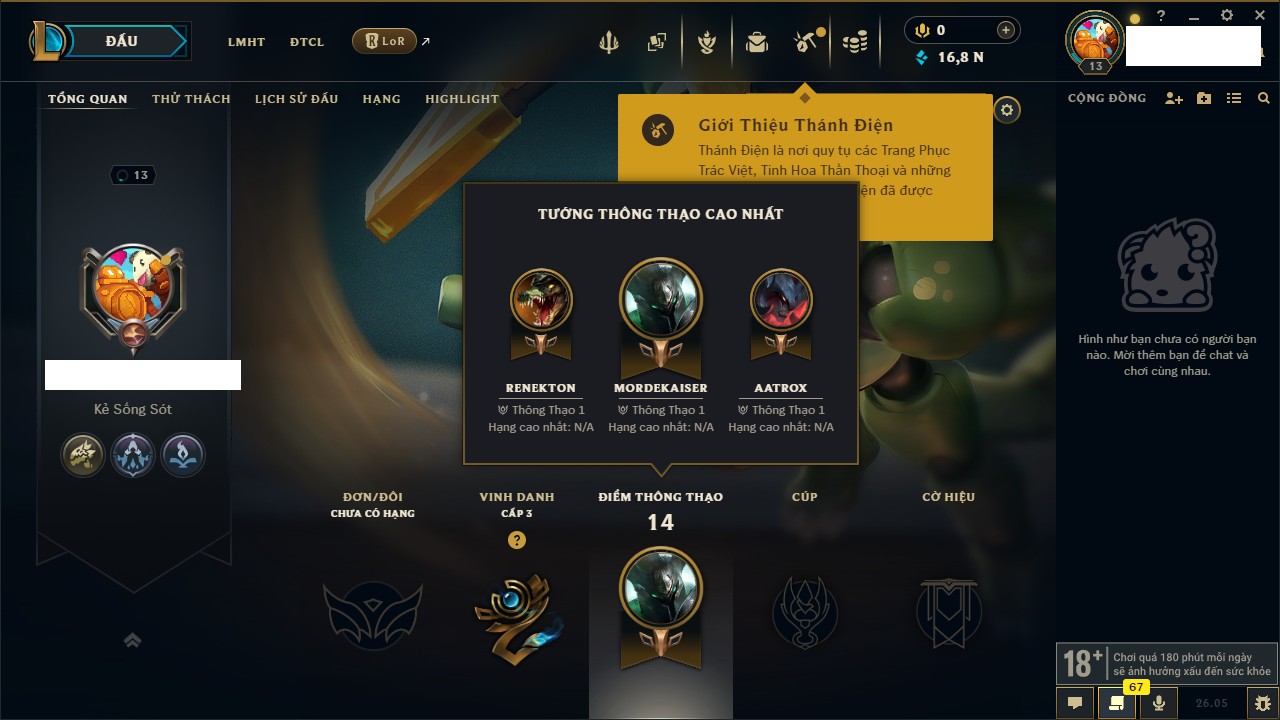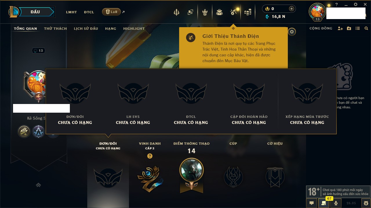 Rank Đơn: Chưa rank mùa nàoKhung: Chưa có khungTướng: 66 - Còn 2350 THXTrang Phục: 0Rank ĐTCL: Chưa RankLinh Thú: 13