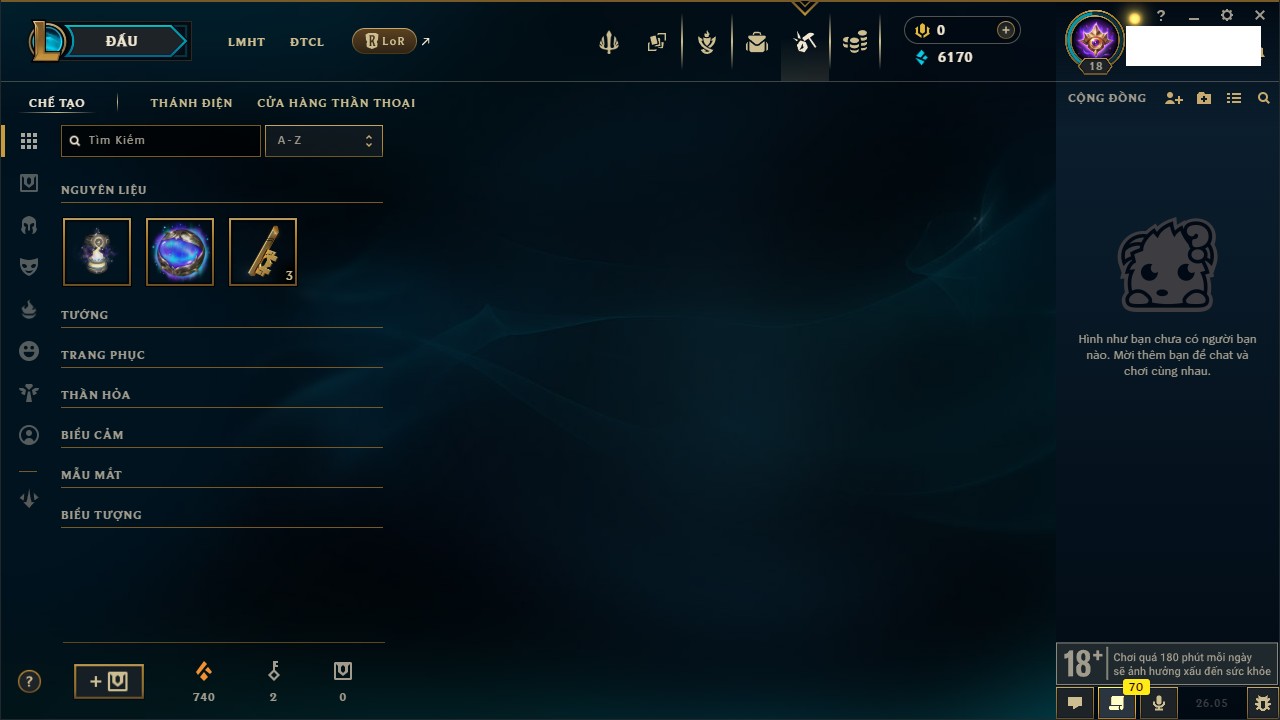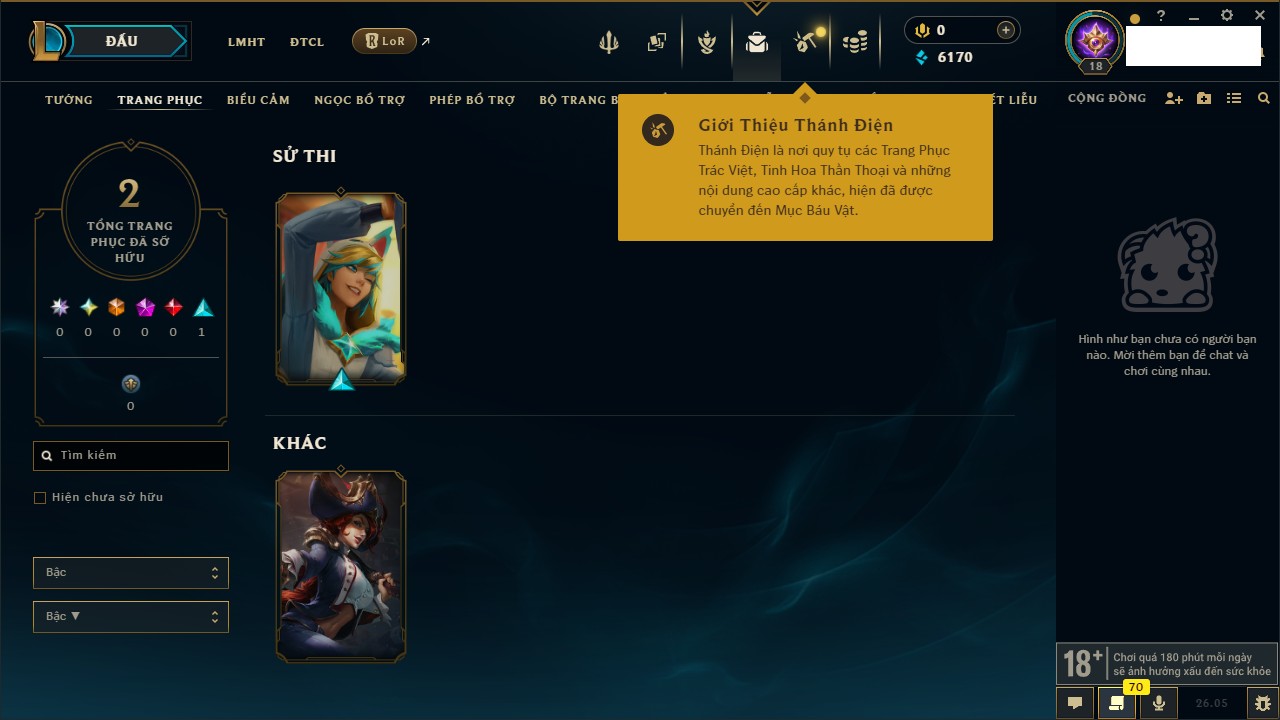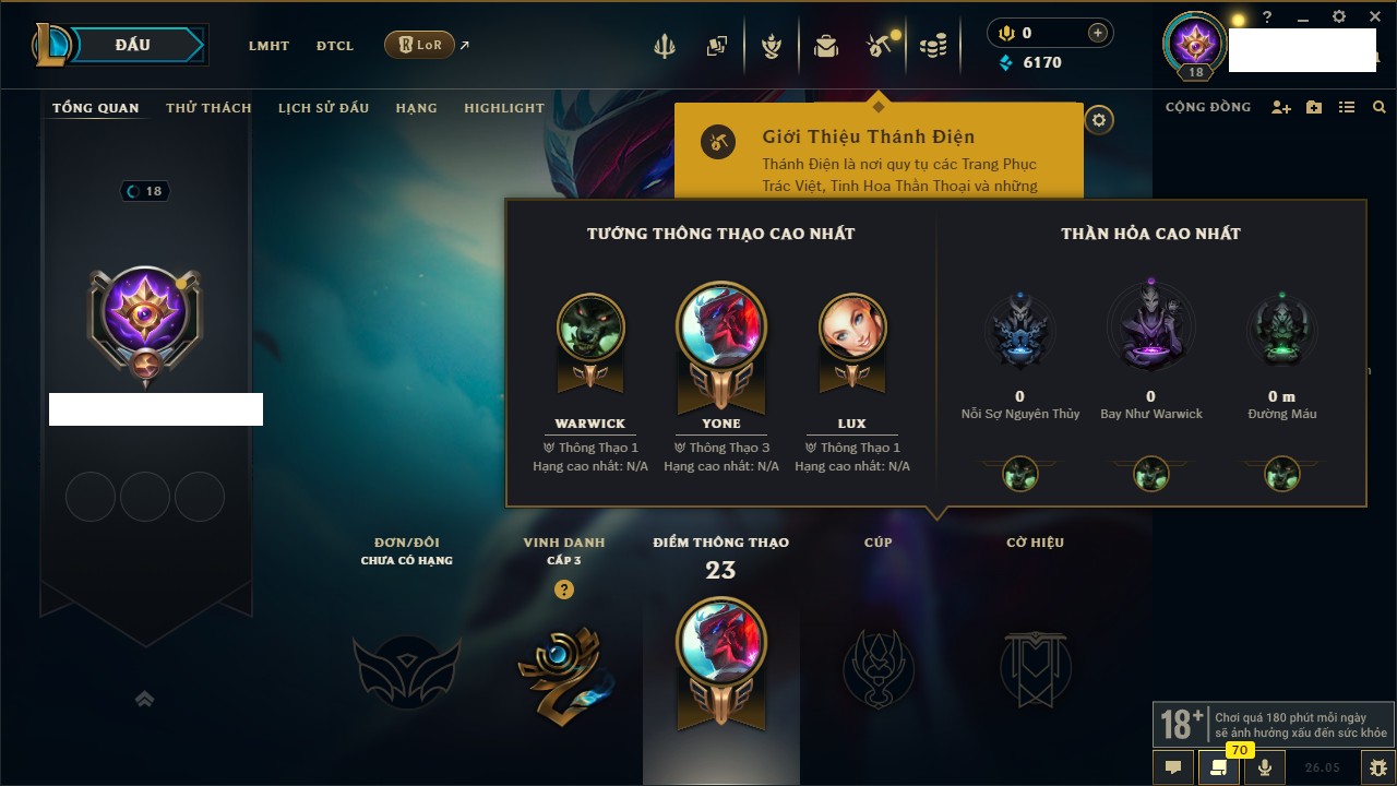 Rank Đơn: Chưa rank mùa nàoKhung: Chưa có khungTướng: 14 - Còn 2855 THXTrang Phục: 1Rank ĐTCL: Chưa RankLinh Thú: 9