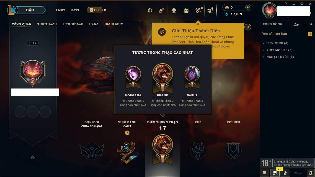 Rank Đơn: Chưa rank mùa nàoKhung: Chưa có khungTướng: 109 - Còn 17800 THXTrang Phục: 0Rank ĐTCL: Chưa RankLinh Thú: 25