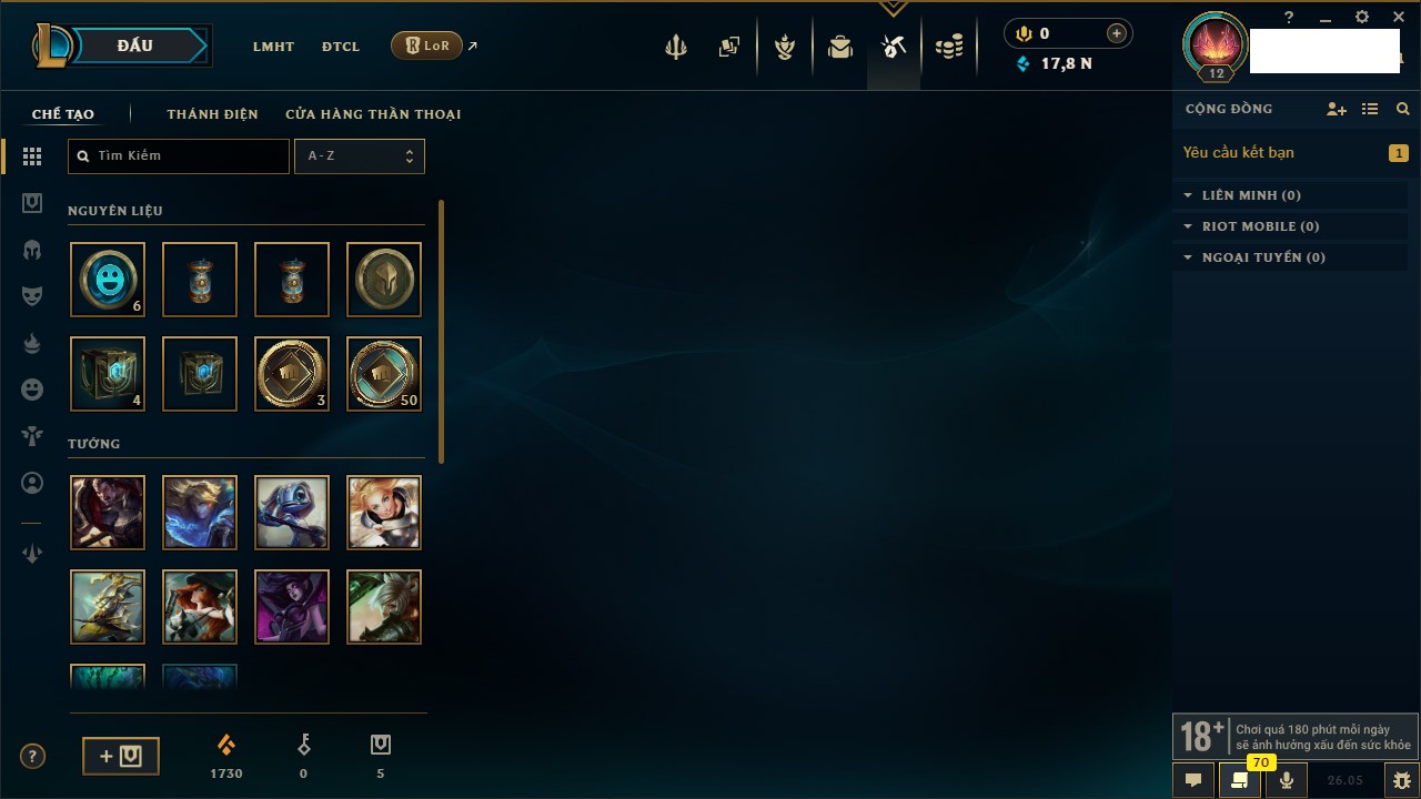 Rank Đơn: Chưa rank mùa nàoKhung: Chưa có khungTướng: 68 - Còn 3050 THXTrang Phục: 0Rank ĐTCL: Chưa RankLinh Thú: 9