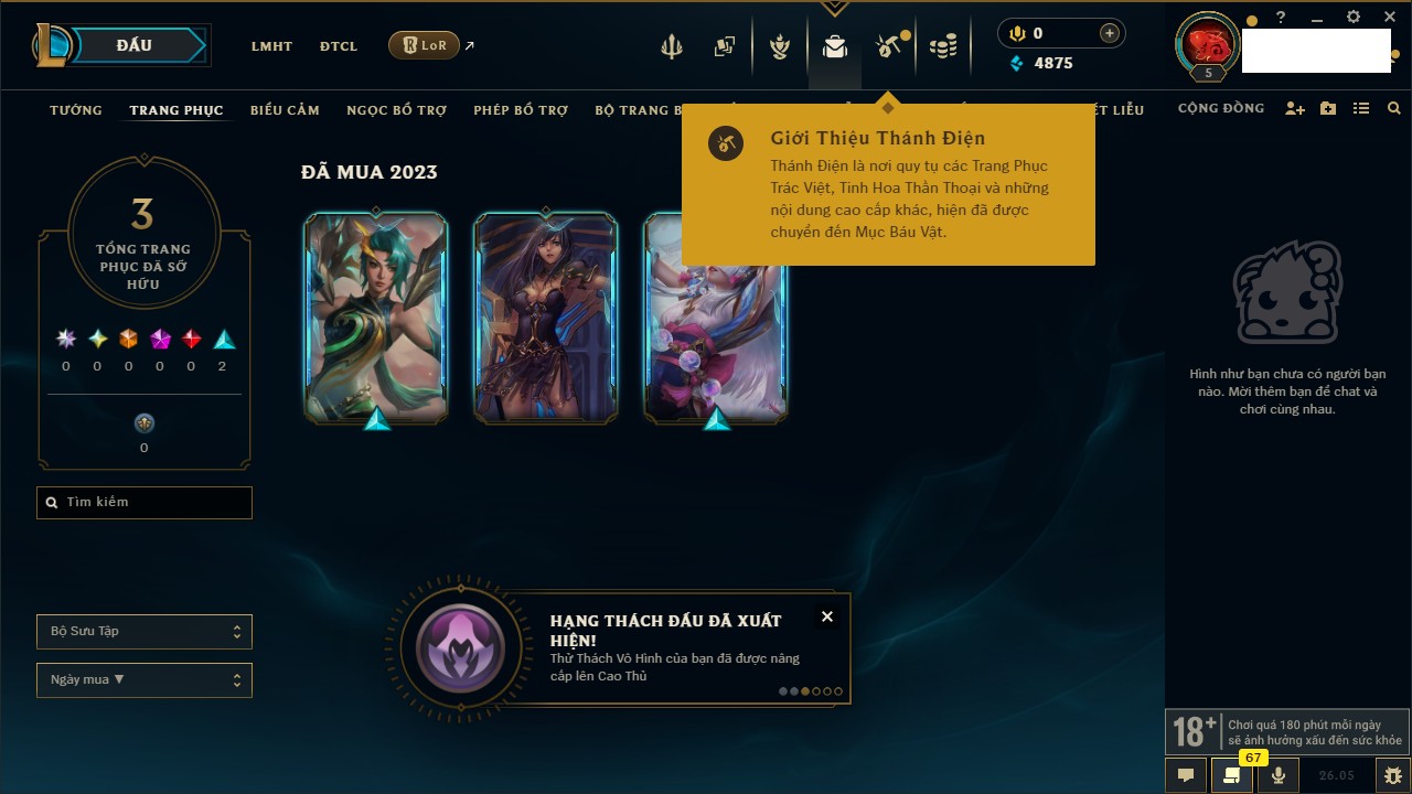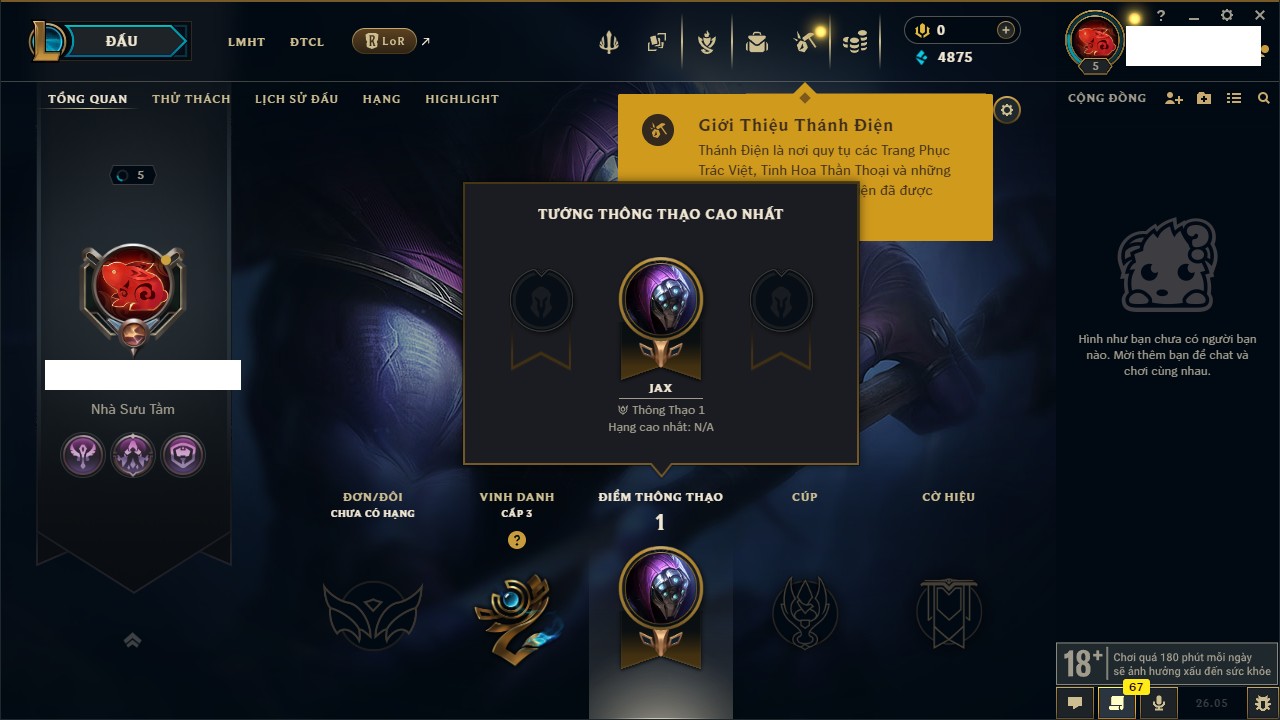 Rank Đơn: Chưa rank mùa nàoKhung: Chưa có khungTướng: 158 - Còn 4875 THXTrang Phục: 3Rank ĐTCL: Chưa RankLinh Thú: 12