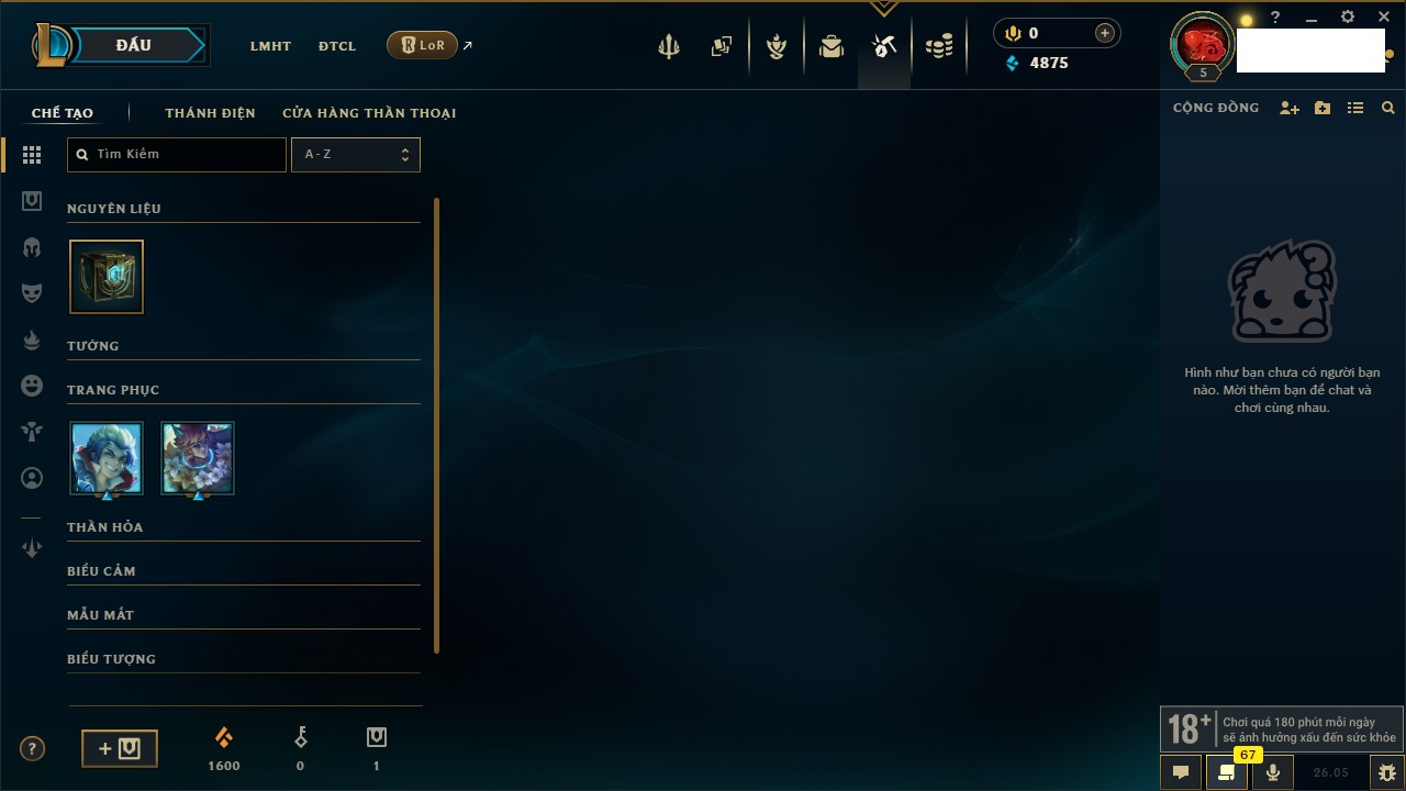 Rank Đơn: Chưa rank mùa nàoKhung: Chưa có khungTướng: 157 - Còn 10430 THXTrang Phục: 4Rank ĐTCL: Chưa RankLinh Thú: 20