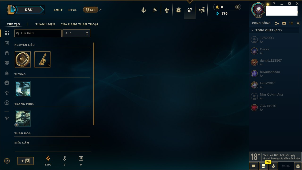 Rank Đơn: Chưa rank mùa nàoKhung: Chưa có khungTướng: 131 - Còn 12830 THXTrang Phục: 8Rank ĐTCL: Chưa RankLinh Thú: 6