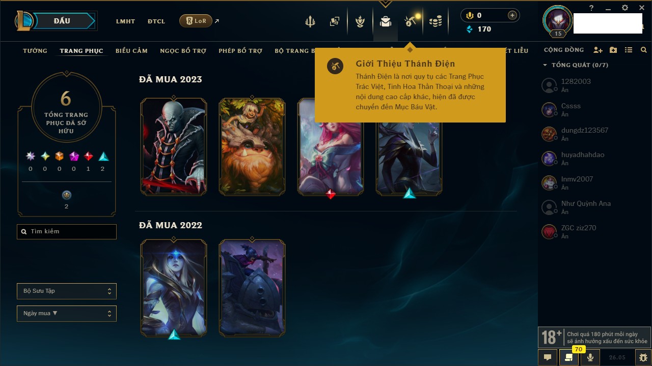 Rank Đơn: Chưa rank mùa nàoKhung: Chưa có khungTướng: 148 - Còn 1440 THXTrang Phục: 2Rank ĐTCL: Chưa RankLinh Thú: 6