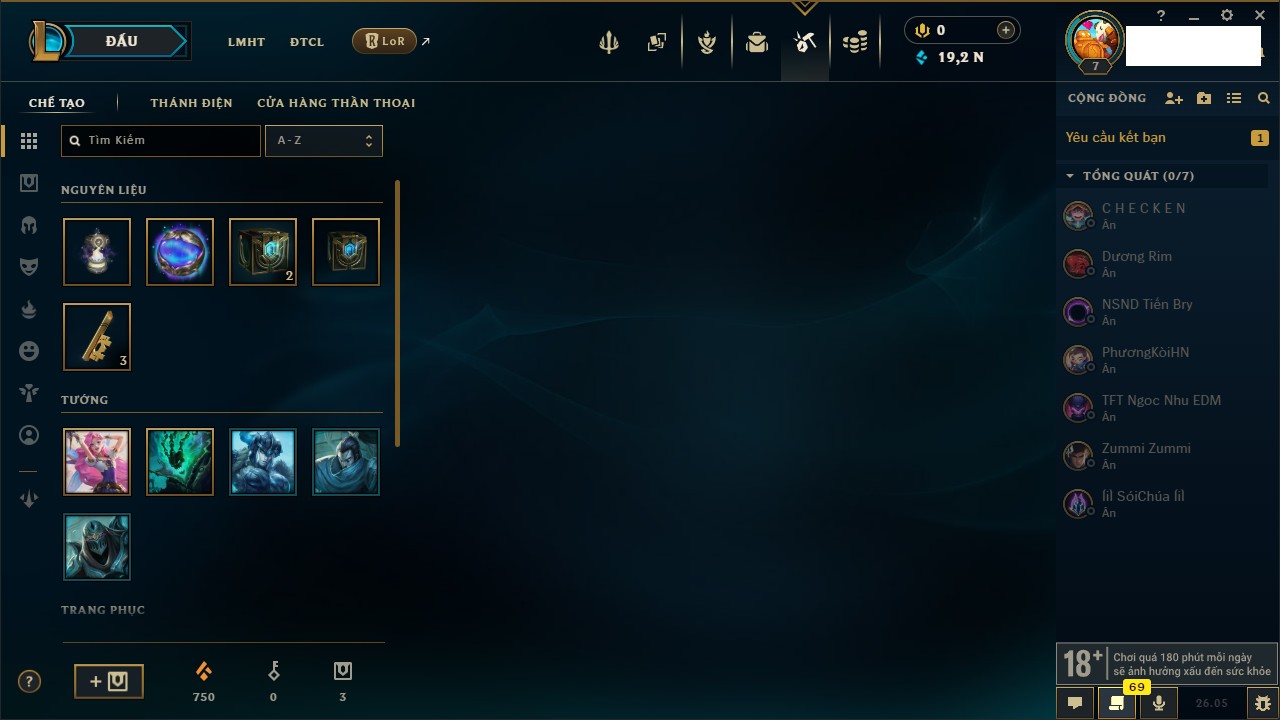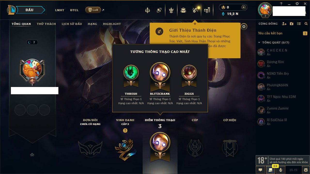 Rank Đơn: Chưa rank mùa nàoKhung: Chưa có khungTướng: 160 - Còn 7629 THXTrang Phục: 5Rank ĐTCL: Chưa RankLinh Thú: 19