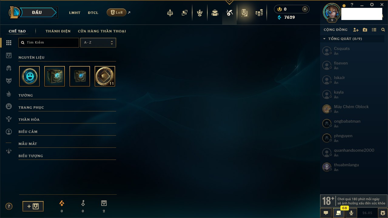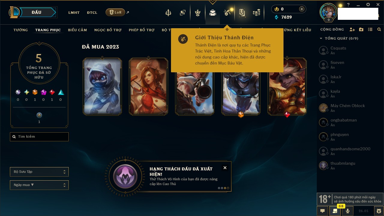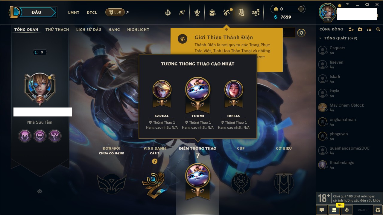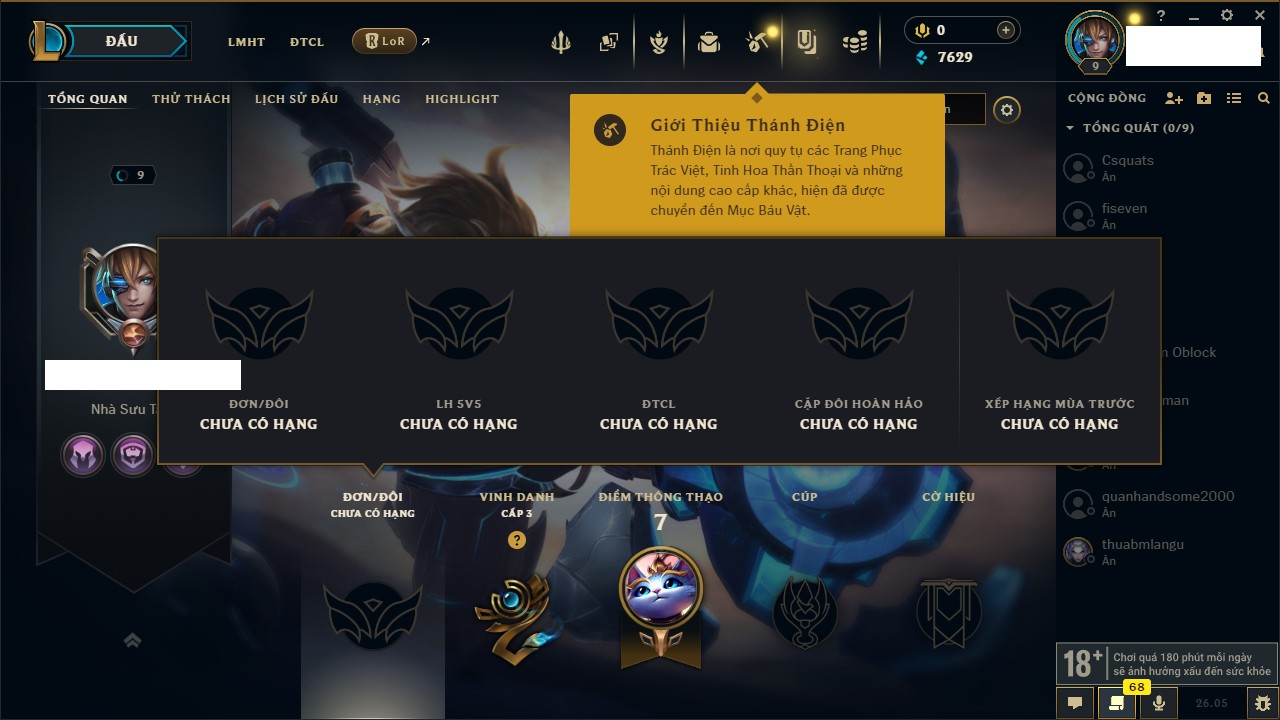 Rank Đơn: Chưa rank mùa nàoKhung: Chưa có khungTướng: 160 - Còn 7629 THXTrang Phục: 5Rank ĐTCL: Chưa RankLinh Thú: 19