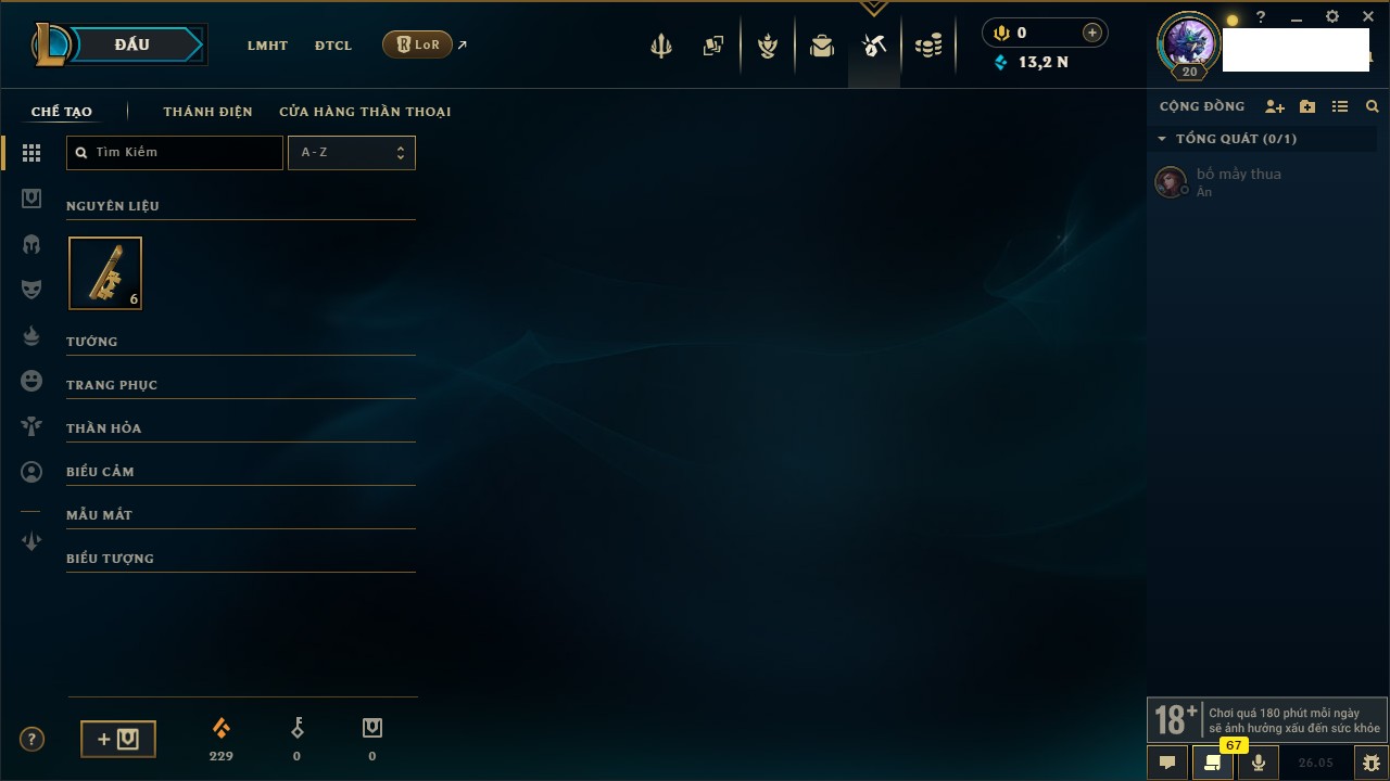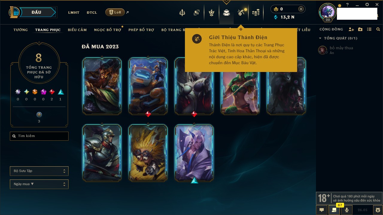 Rank Đơn: Chưa rank mùa nàoKhung: Chưa có khungTướng: 157 - Còn 13280 THXTrang Phục: 8Rank ĐTCL: Chưa RankLinh Thú: 11