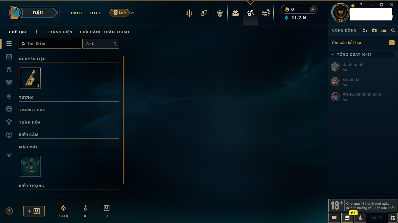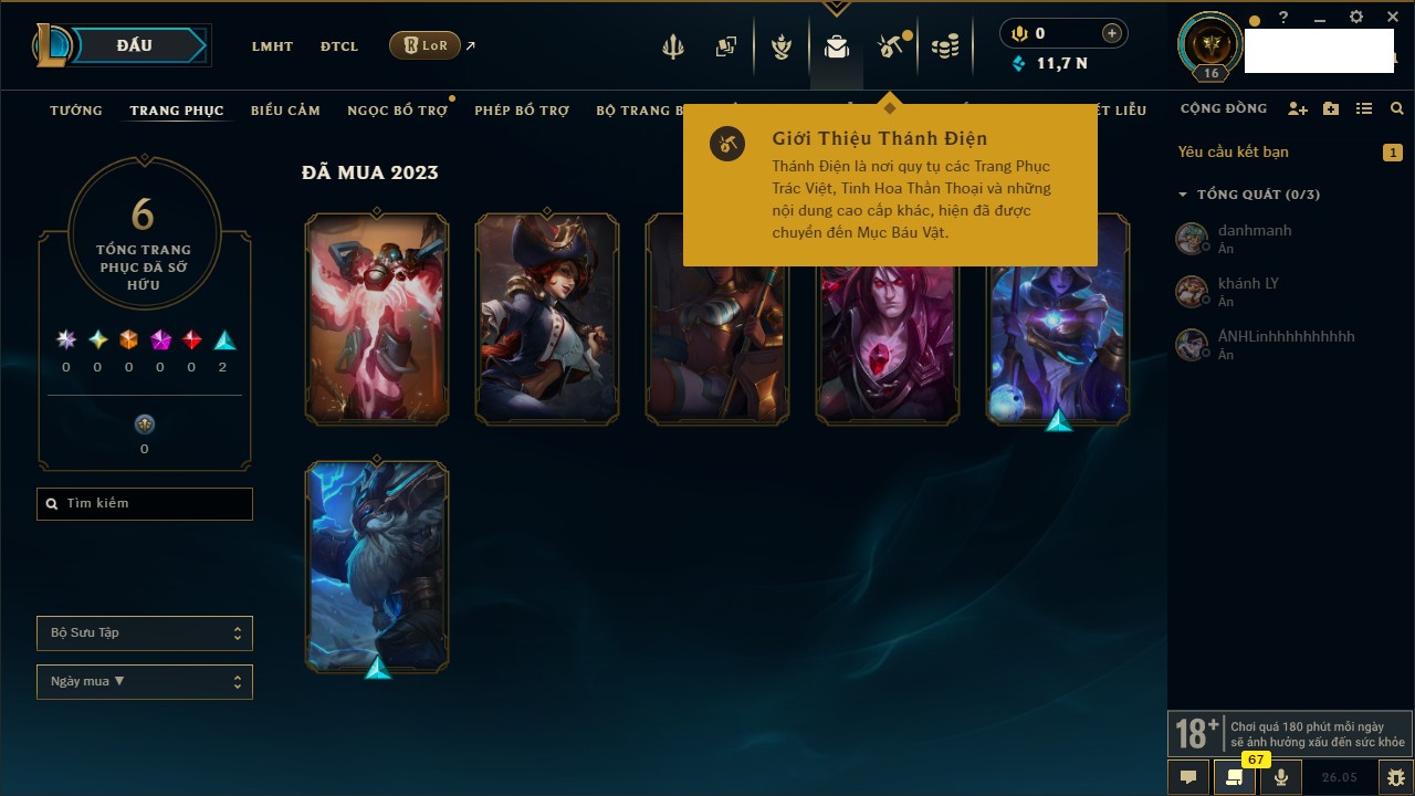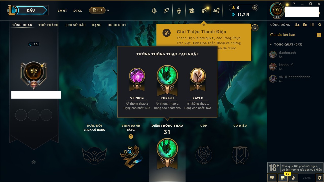 Rank Đơn: Chưa rank mùa nàoKhung: Chưa có khungTướng: 154 - Còn 1660 THXTrang Phục: 6Rank ĐTCL: Chưa RankLinh Thú: 18