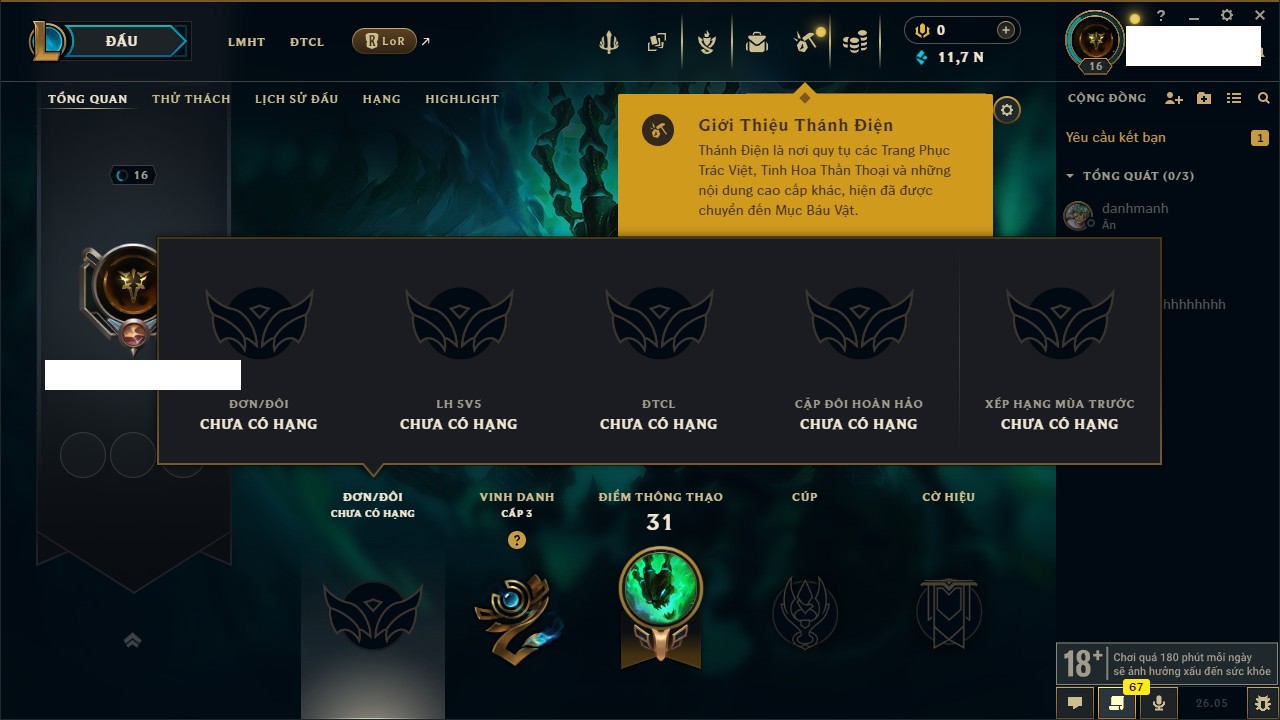 Rank Đơn: Chưa rank mùa nàoKhung: Chưa có khungTướng: 157 - Còn 11755 THXTrang Phục: 6Rank ĐTCL: Chưa RankLinh Thú: 24