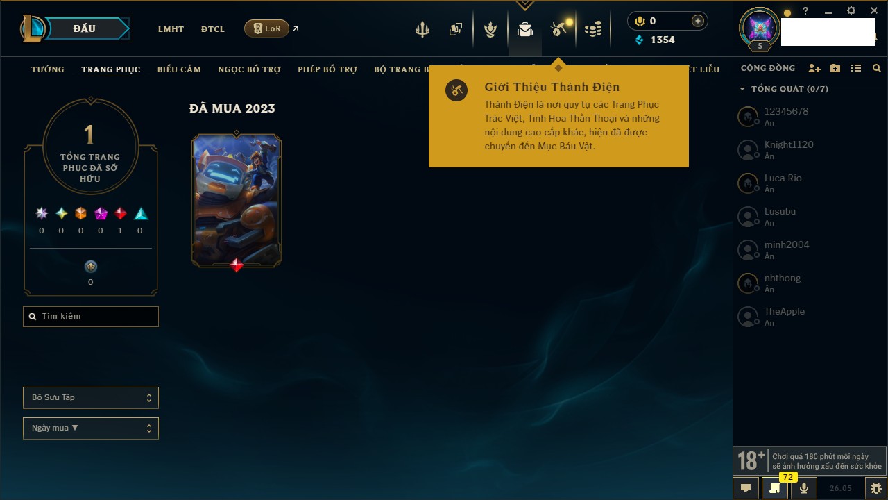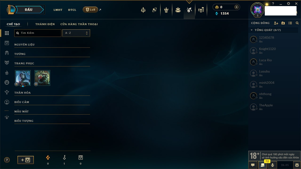 Rank Đơn: Chưa rank mùa nàoKhung: Chưa có khungTướng: 27 - Còn 2900 THXTrang Phục: 4Rank ĐTCL: Chưa RankLinh Thú: 24