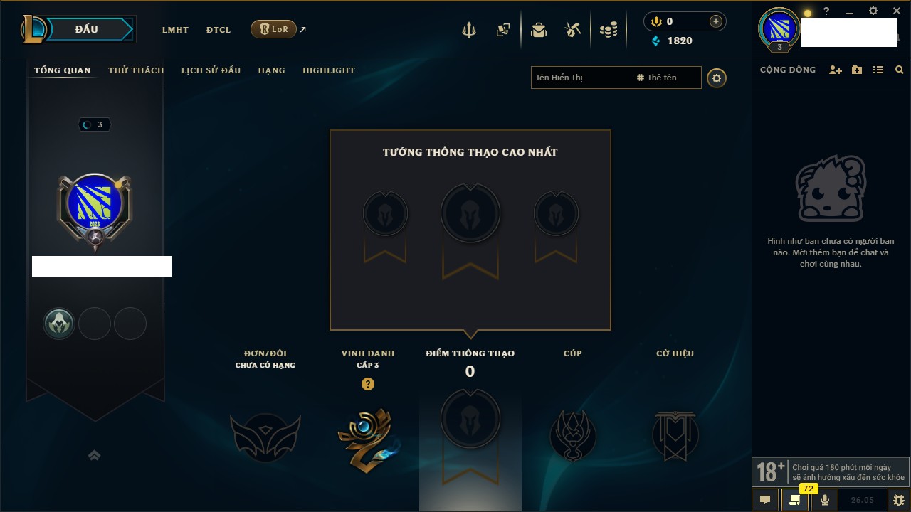 Rank Đơn: Chưa rank mùa nàoKhung: Chưa có khungTướng: 66 - Còn 2350 THXTrang Phục: 0Rank ĐTCL: Chưa RankLinh Thú: 13