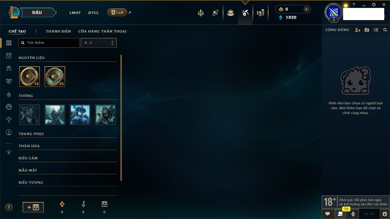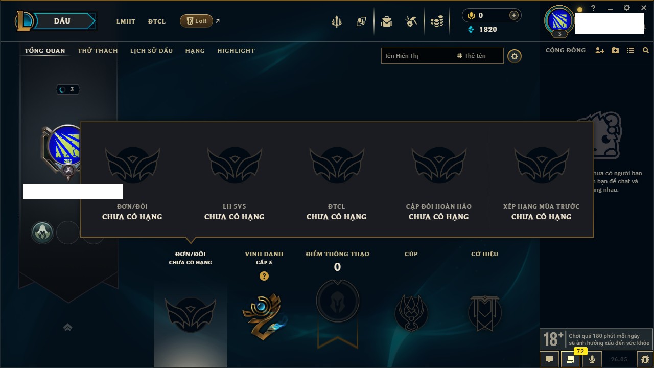 Rank Đơn: Chưa rank mùa nàoKhung: Chưa có khungTướng: 75 - Còn 4086 THXTrang Phục: 1Rank ĐTCL: Chưa RankLinh Thú: 7