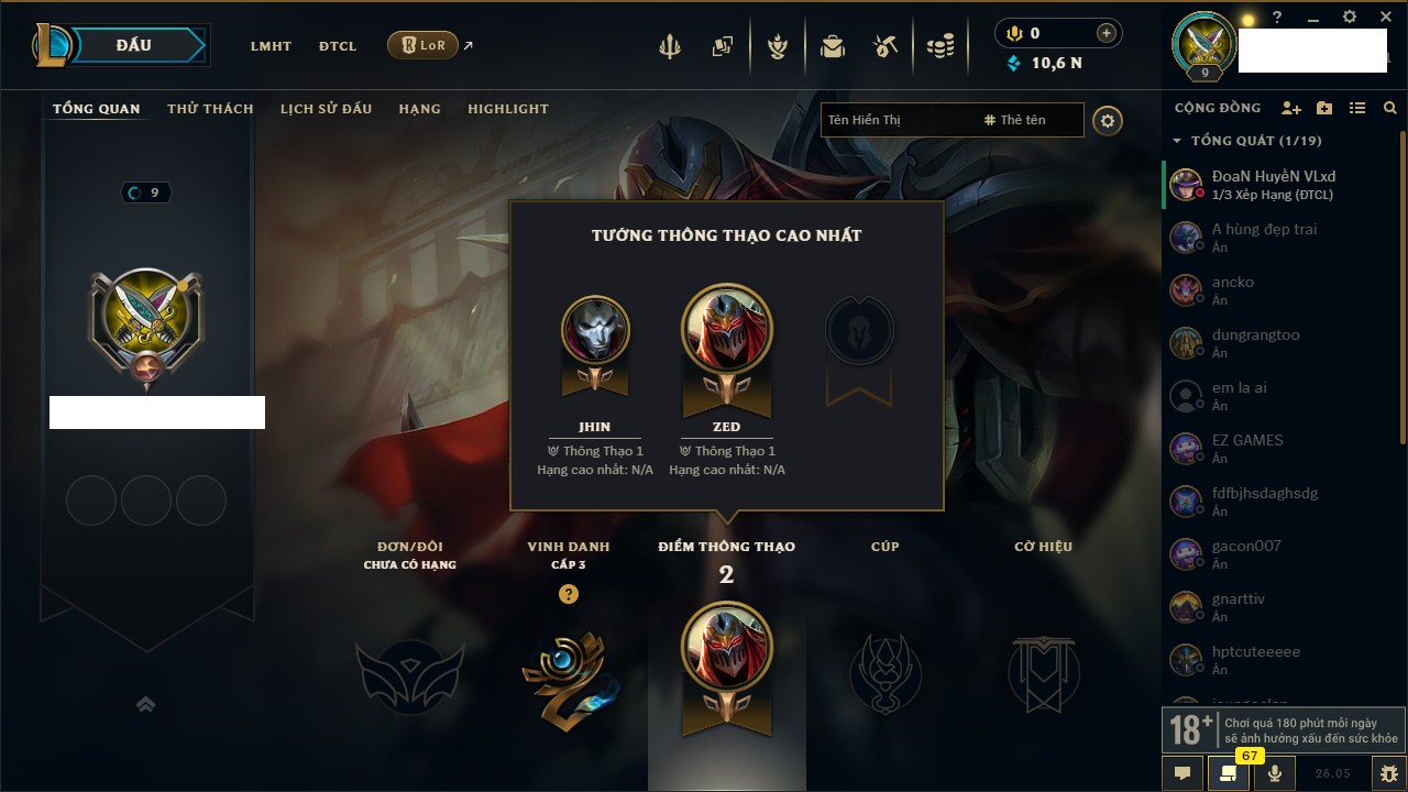Rank Đơn: Chưa rank mùa nàoKhung: Chưa có khungTướng: 157 - Còn 10600 THXTrang Phục: 0Rank ĐTCL: Chưa RankLinh Thú: 17