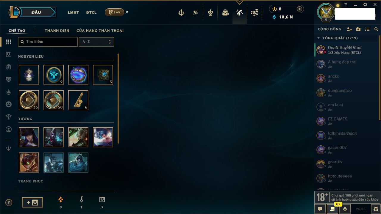 Rank Đơn: Chưa rank mùa nàoKhung: Chưa có khungTướng: 0 - Còn 4000 THXTrang Phục: 0Rank ĐTCL: Chưa rank mùa nàoLinh Thú: 18