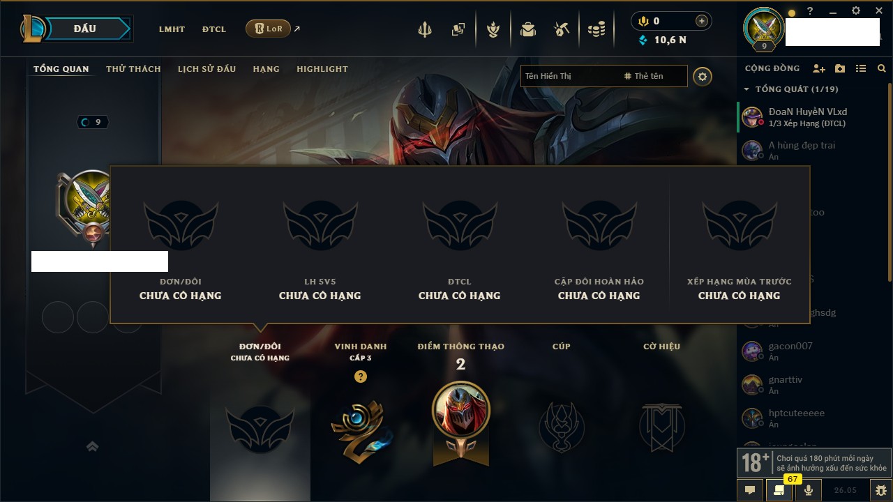 Rank Đơn: Chưa rank mùa nàoKhung: Chưa có khungTướng: 4 - Còn 20680 THXTrang Phục: 0Rank ĐTCL: Chưa rank mùa nàoLinh Thú: 15