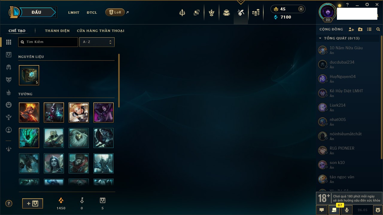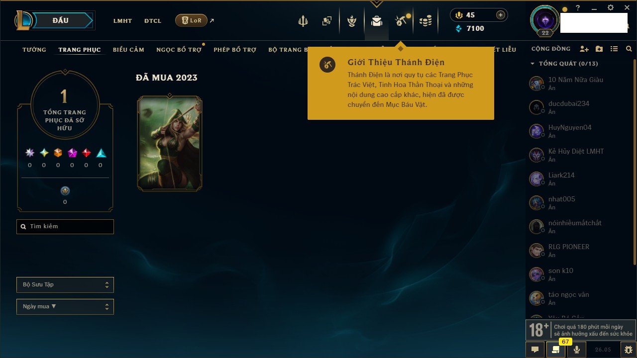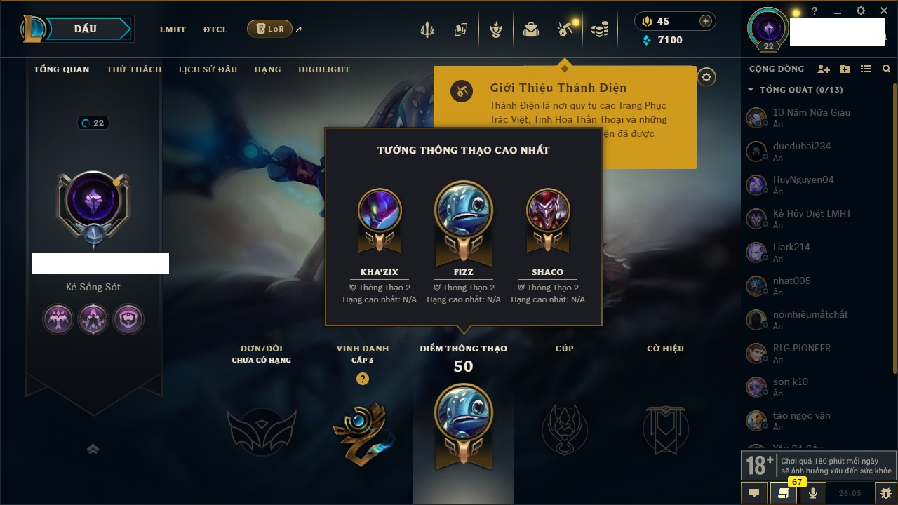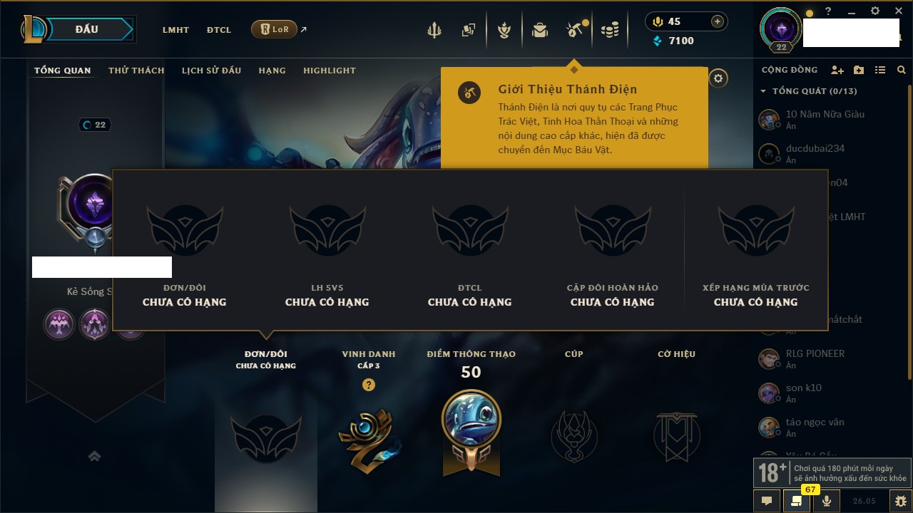Rank Đơn: Chưa rank mùa nàoKhung: Chưa có khungTướng: 154 - Còn 1660 THXTrang Phục: 6Rank ĐTCL: Chưa RankLinh Thú: 18