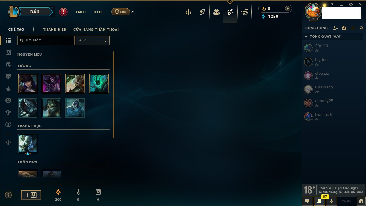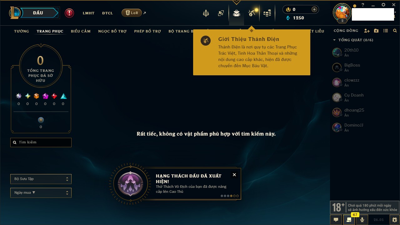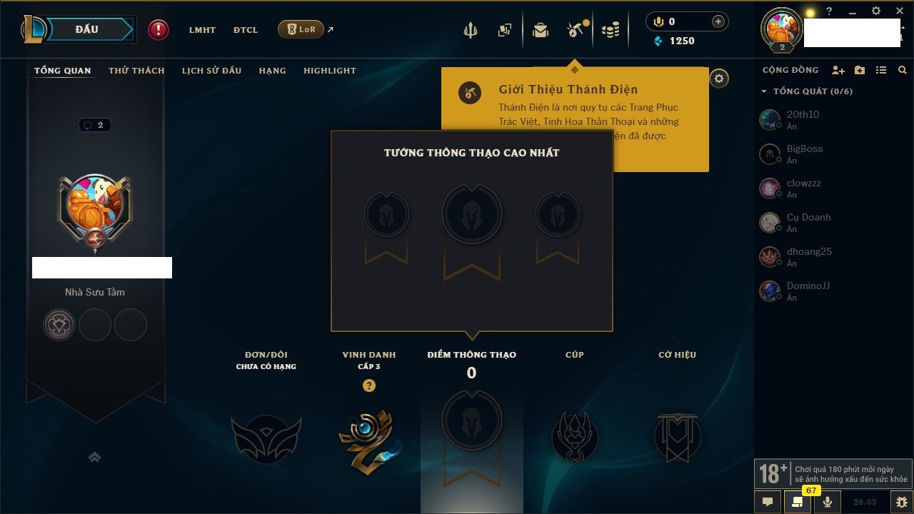 Rank Đơn: Chưa rank mùa nàoKhung: Chưa có khungTướng: 154 - Còn 1660 THXTrang Phục: 6Rank ĐTCL: Chưa RankLinh Thú: 18