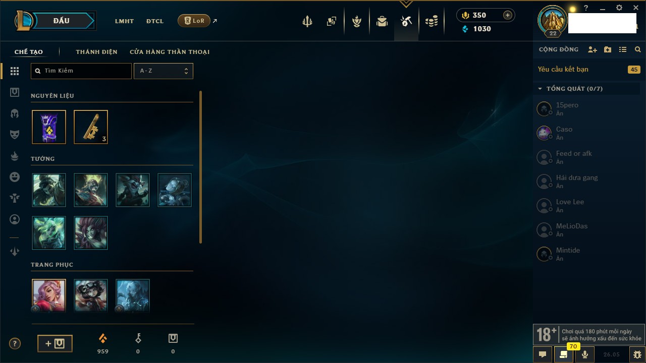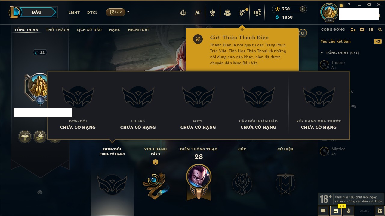 Rank Đơn: Chưa rank mùa nàoKhung: Chưa có khungTướng: 70 - Còn 7630 THXTrang Phục: 0Rank ĐTCL: Chưa RankLinh Thú: 5